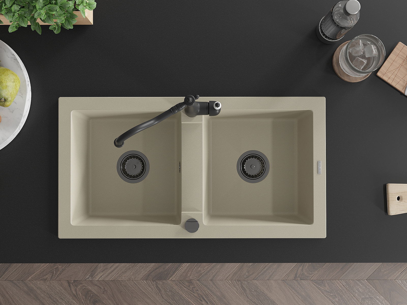 Mexen Mario гранитна мивка с 2 камери и кухненски смесител Carla, бежов - 6504-69-670700-70
