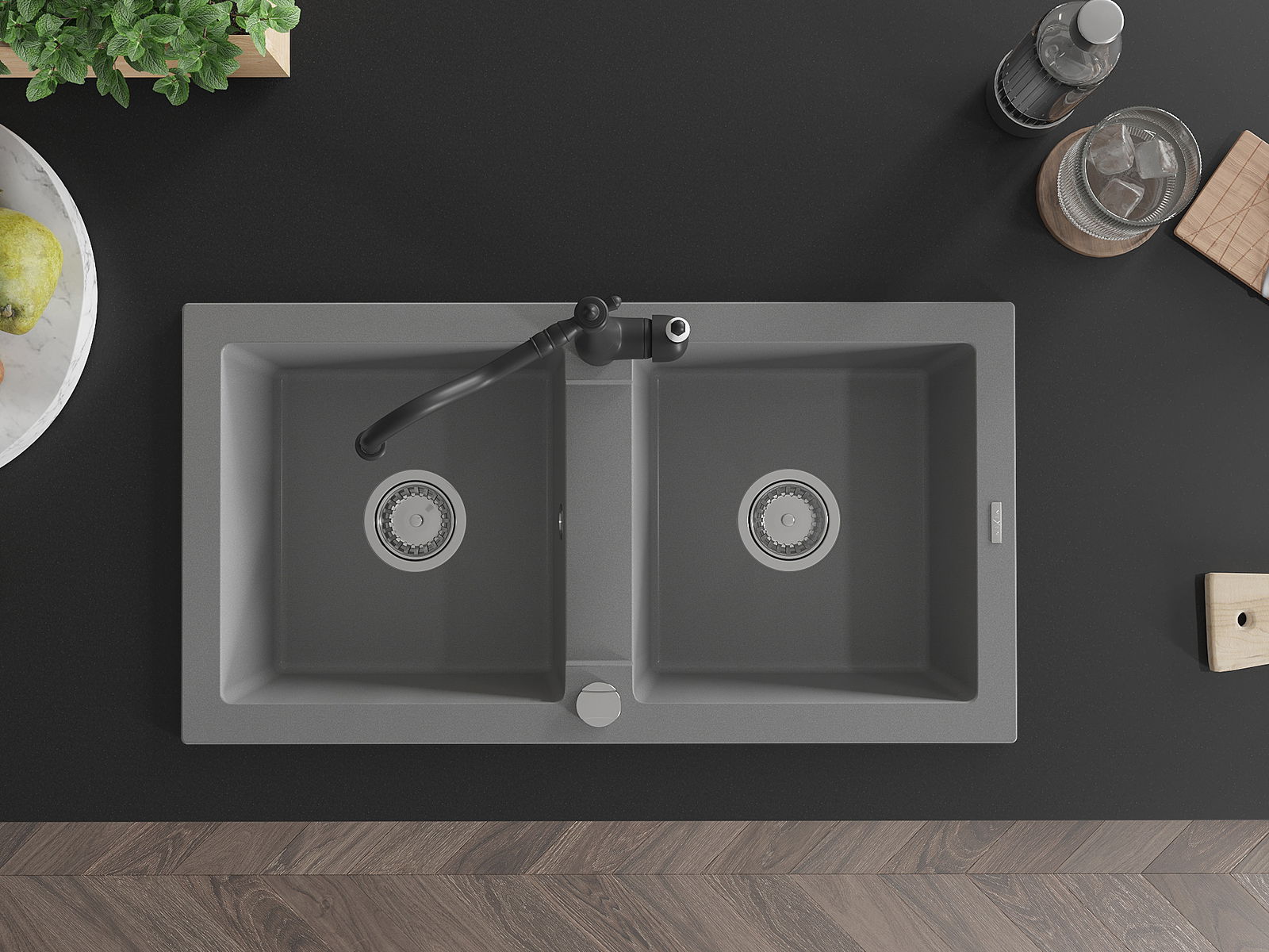 Mexen Mario гранитна мивка с 2 отделения и кухненски смесител Carla, сив - 6504-71-670700-70