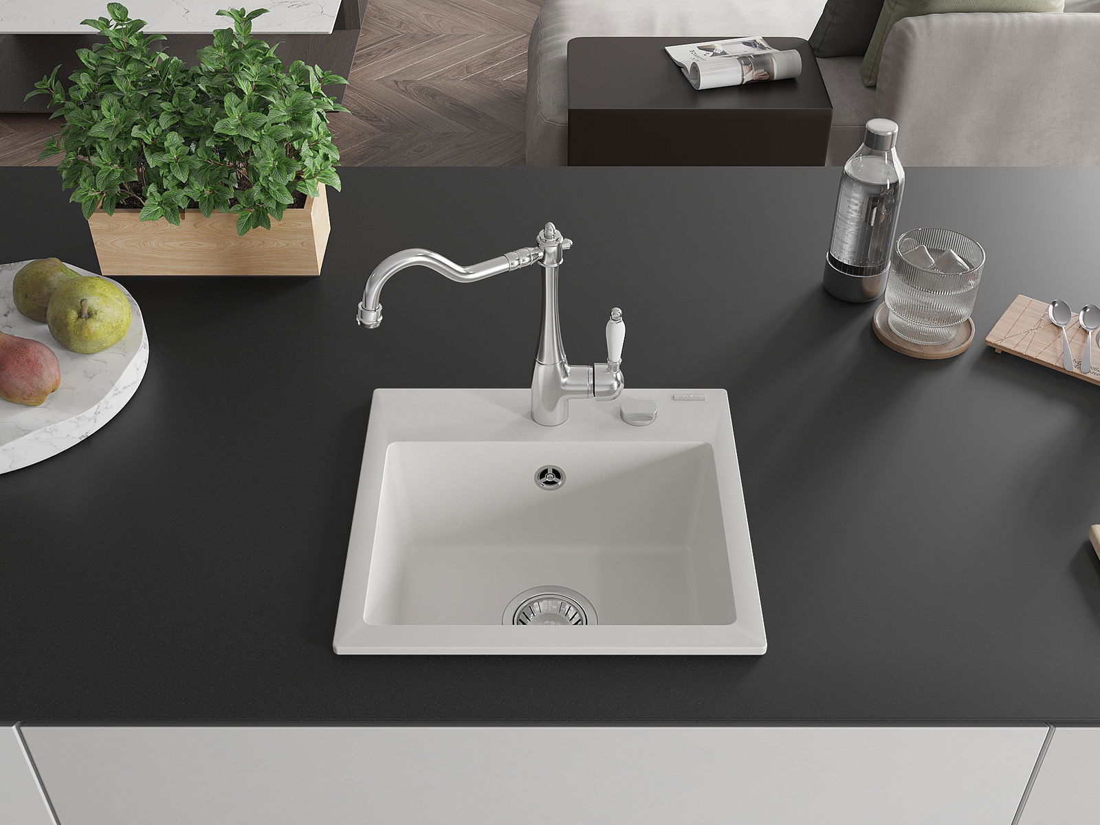 Мивката е направена от висококачествен гранит. Това е елегантно и най -вече практично допълнение към всяка кухня, независимо от нейния стил. Висококачествената и гранитна издръжливост осигуряват много години употреба.