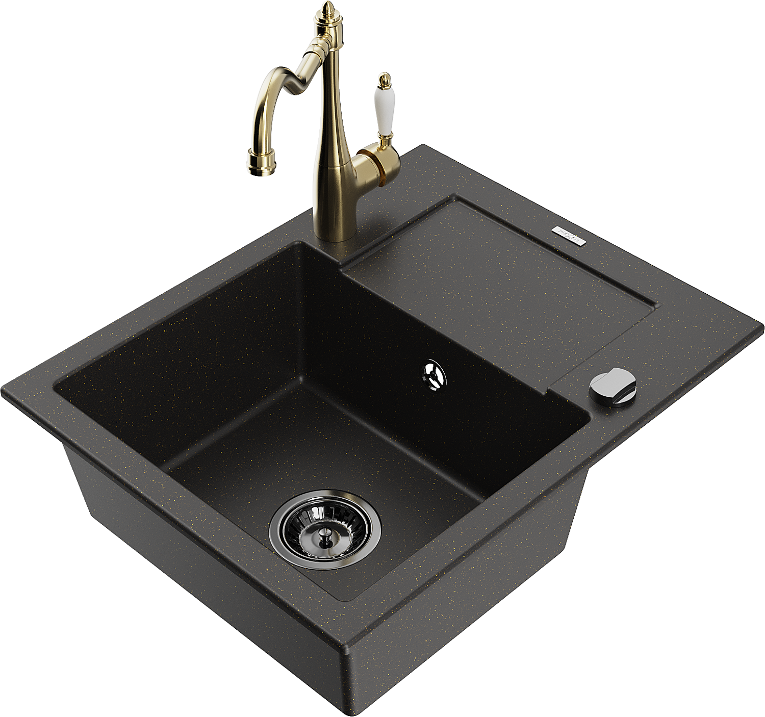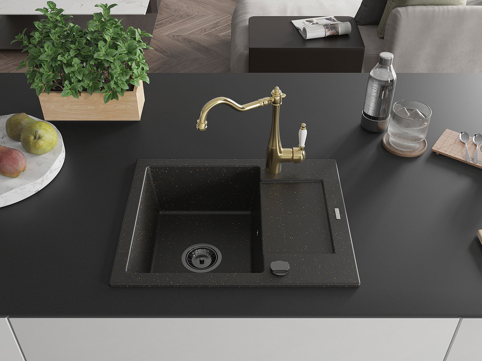Mexen Enzo гранитна кухненска мивка с 1 отделение с отцедник и кухненски смесител Carla, черен/златист металик - 6506-75-670700?