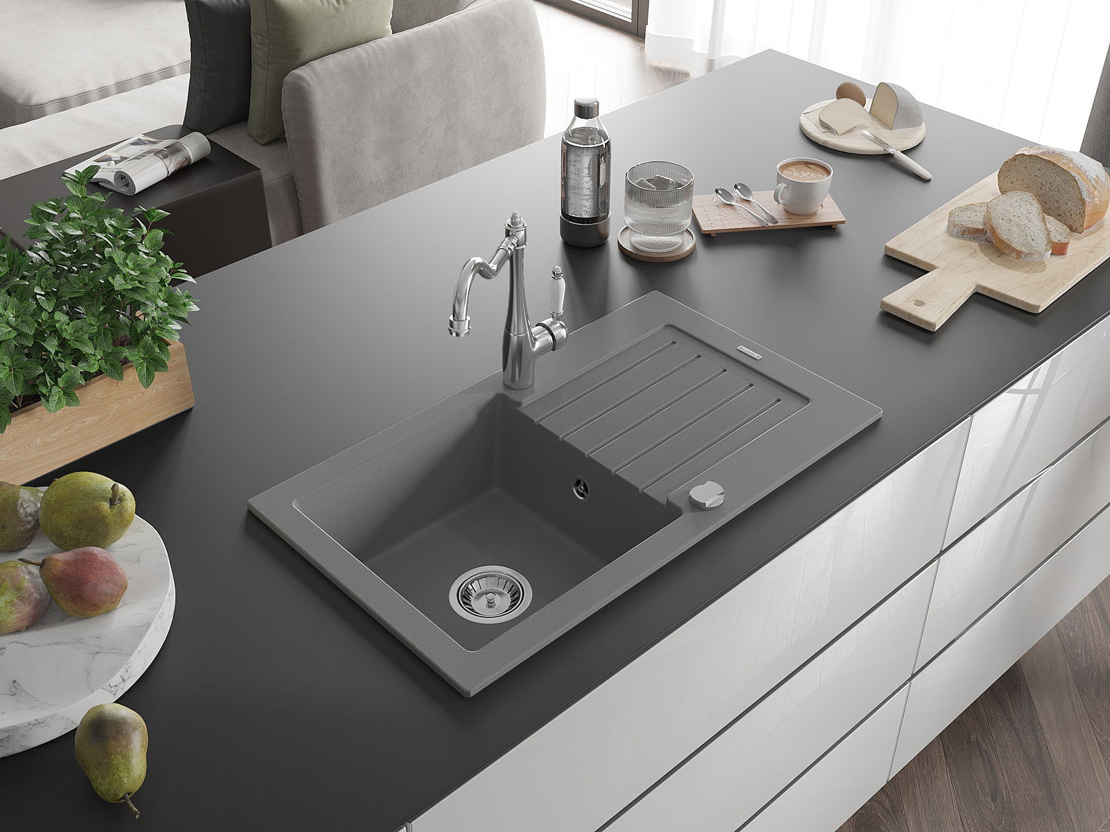 Мивката е направена от висококачествен гранит. Това е елегантно и най -вече практично допълнение към всяка кухня, независимо от нейния стил. Висококачествената и гранитна издръжливост осигуряват много години употреба.