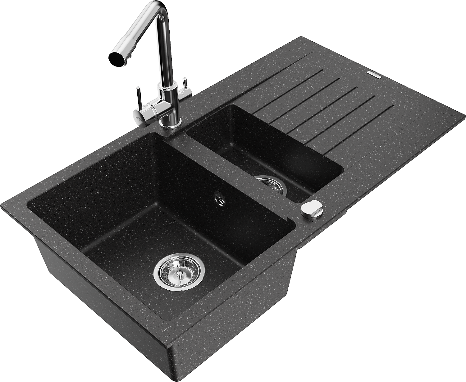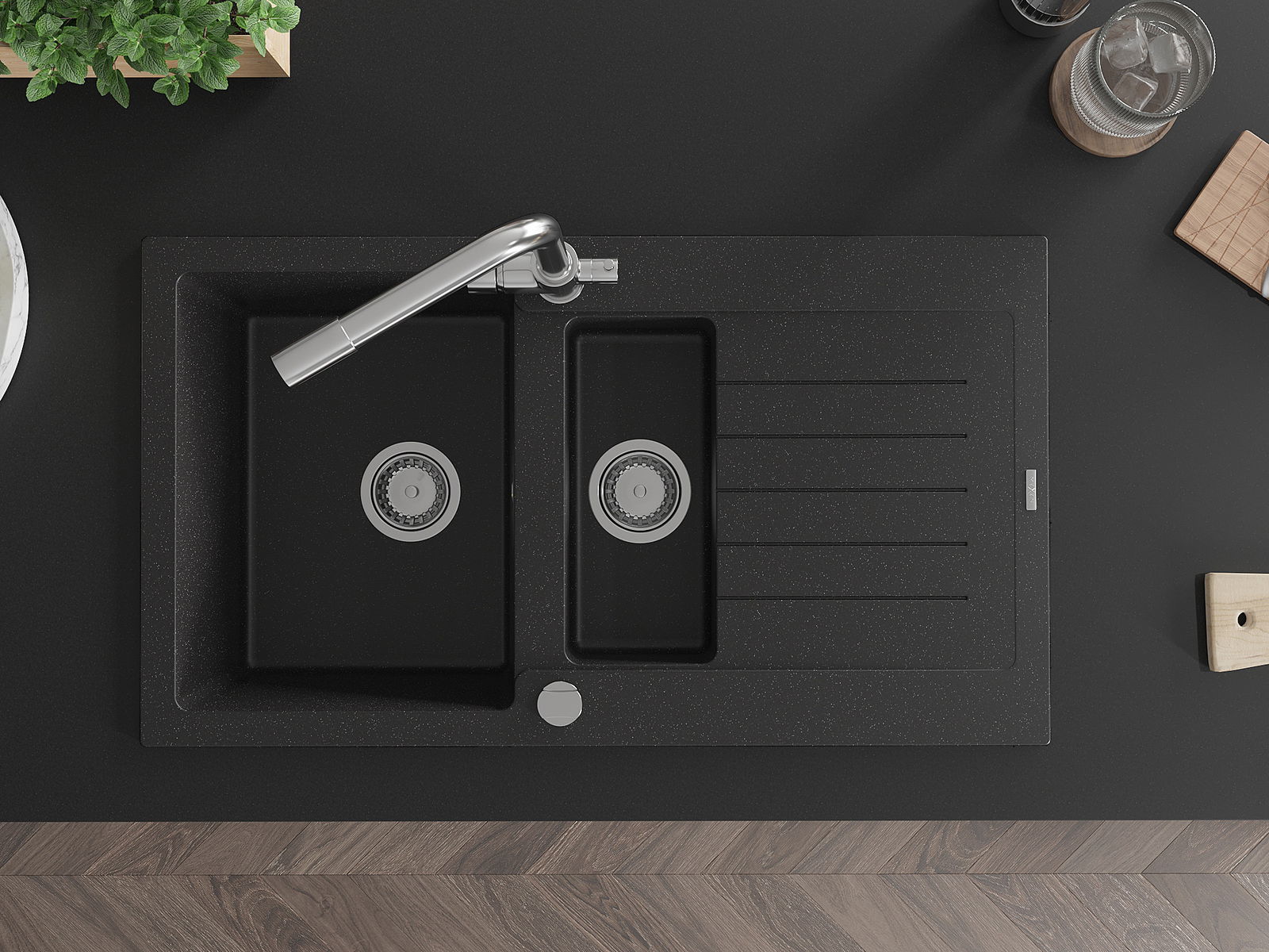 Granitowa кухненска мивка Mexen Matias 1,5-камерна с отцедник и кухненски смесител Duero, черен/сребърен металик - 6502-73-6716?
