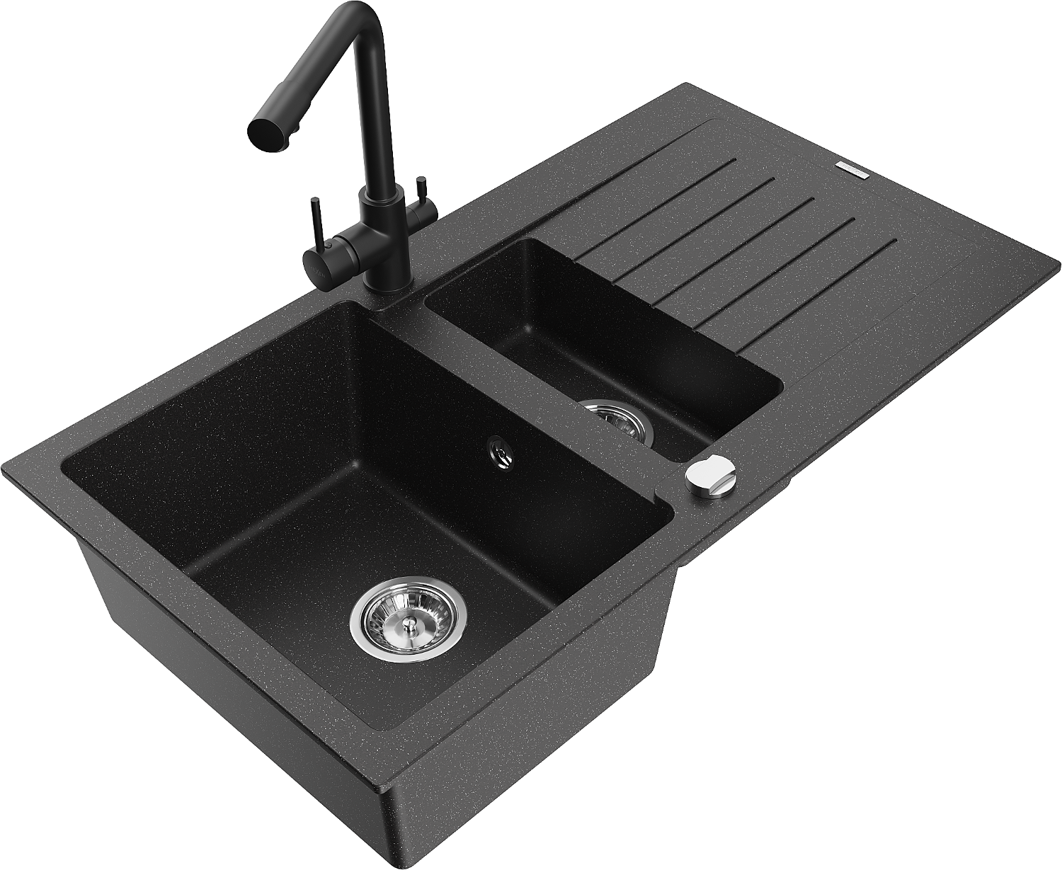 Mexen Matias гранитна мивка 1,5-коморна с отцедник и кухненски смесител Duero, черен/сребрист металик- 6502-73-671600-70