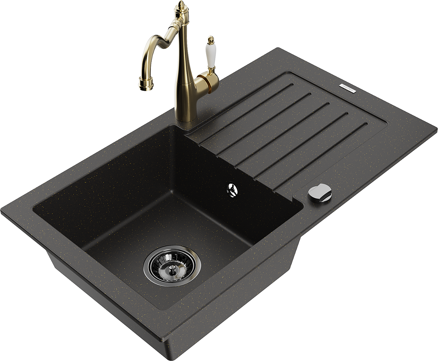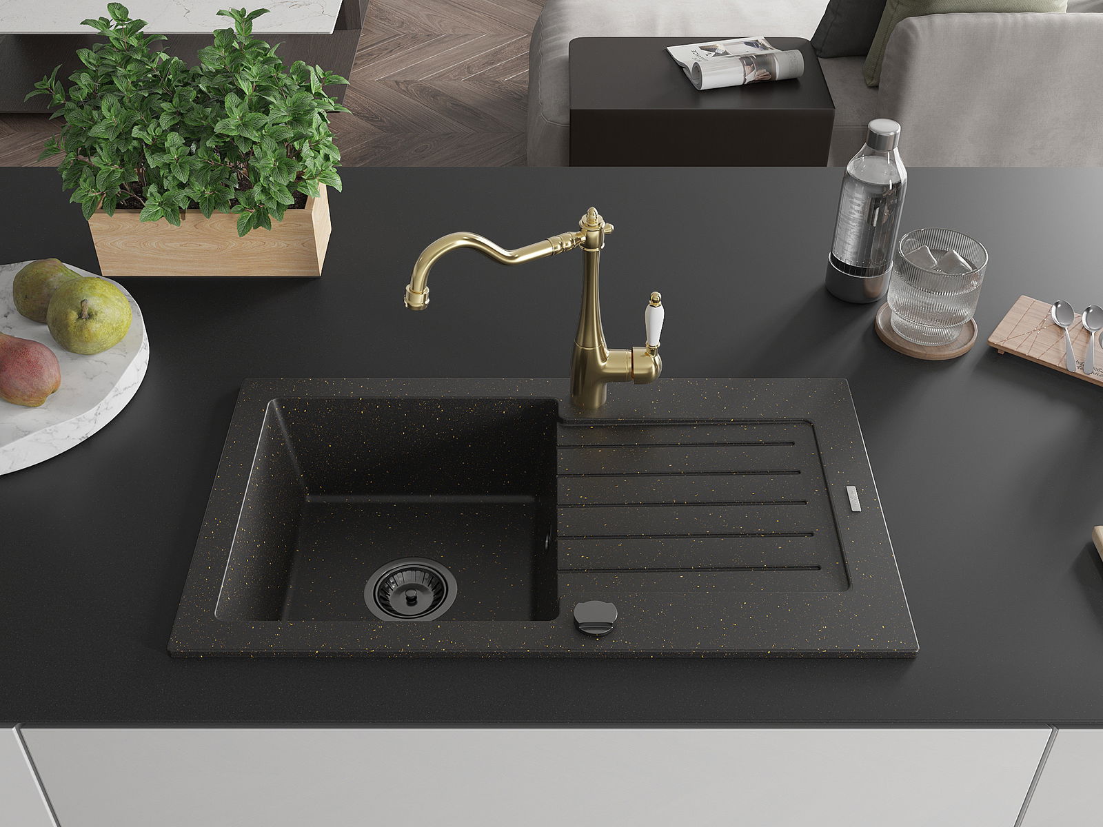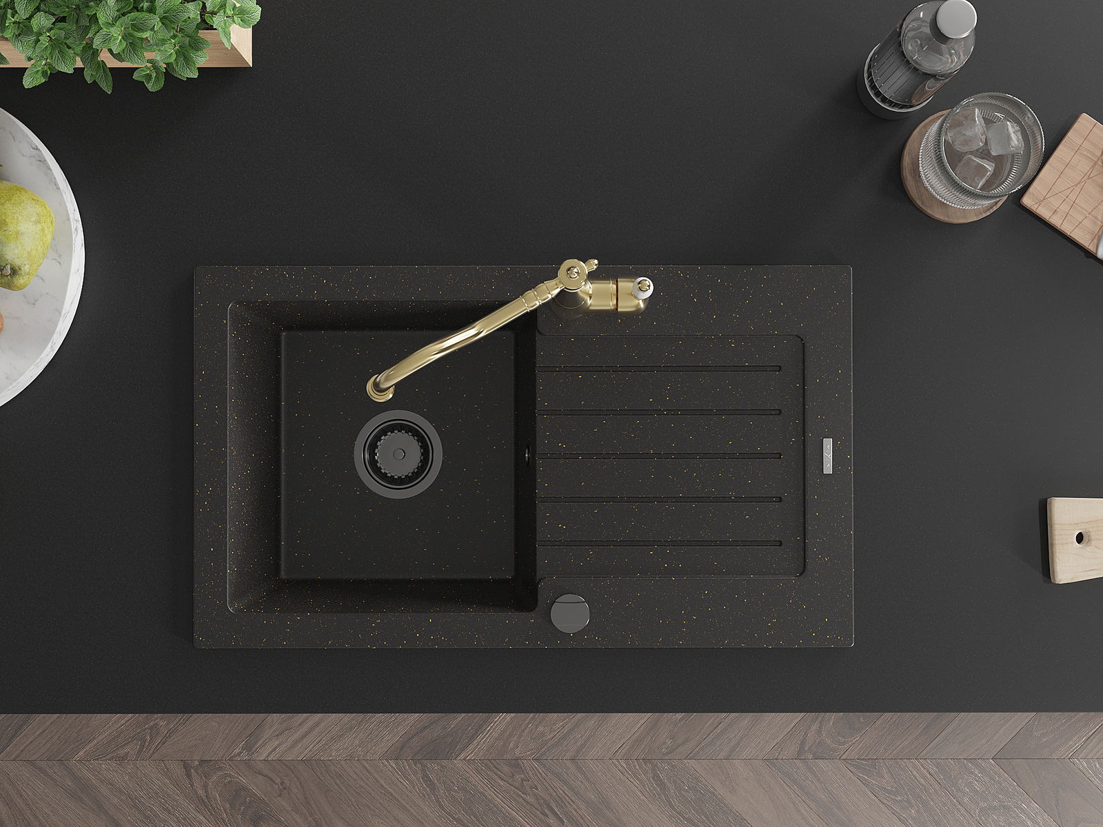 Mexen Pablo гранитна мивка с една камера с отцедник и кухненски смесител Carla, черен/златист металик - 6510-75-670700-50-B