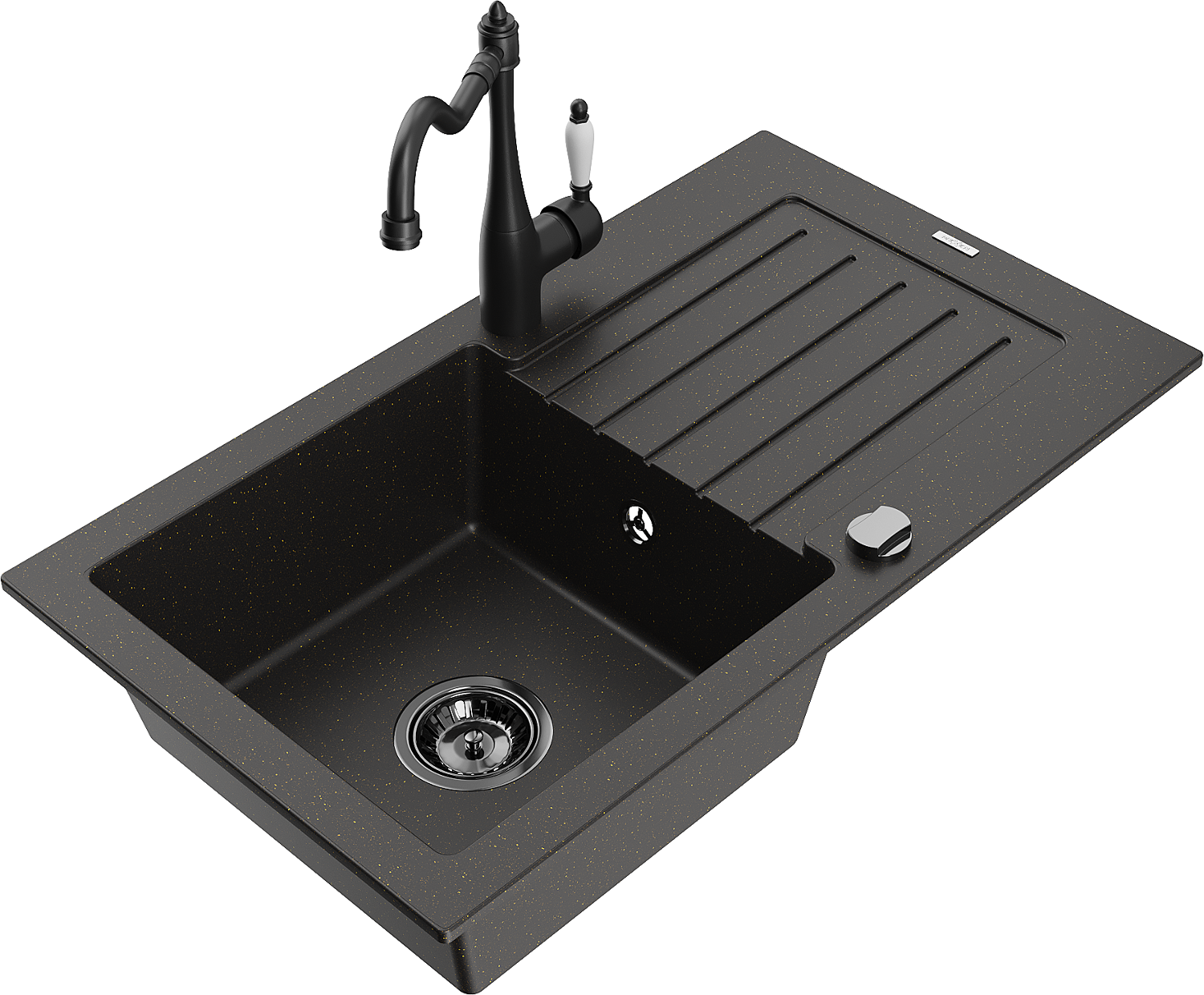 Mexen Pablo гранитна мивка с 1 корито с отцедник и кухненски смесител Carla, черен/златен металик - 6510-75-670700-70-B