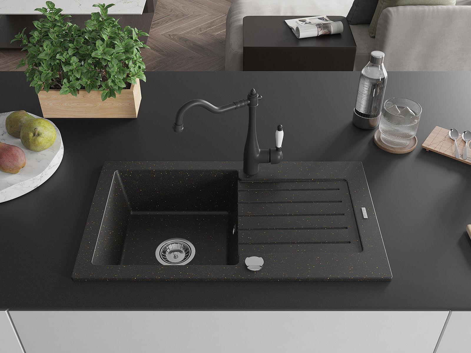 Мивката е направена от висококачествен гранит. Това е елегантно и най -вече практично допълнение към всяка кухня, независимо от нейния стил. Висококачествената и гранитна издръжливост осигуряват много години употреба.