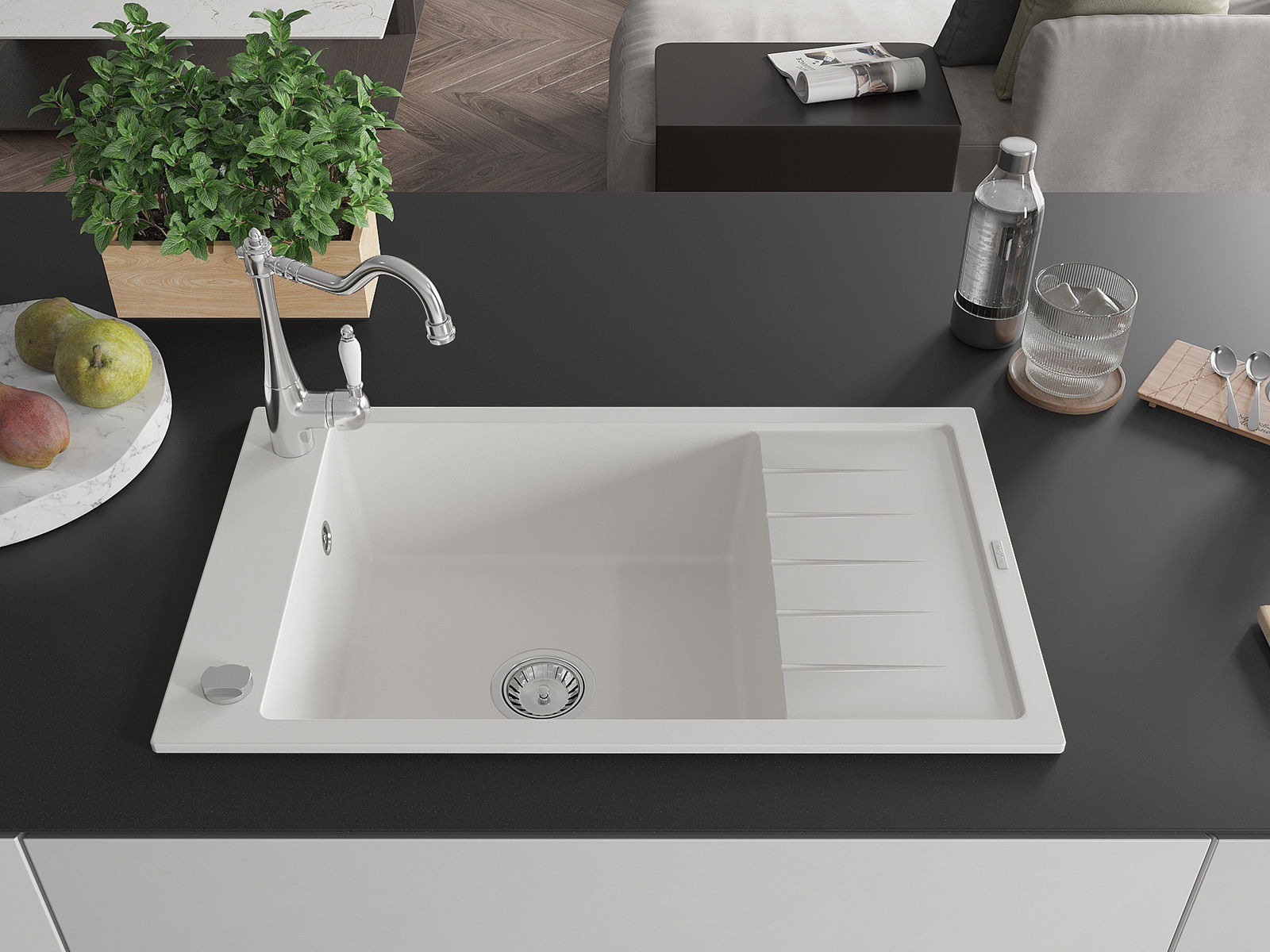 Мивката е направена от висококачествен гранит. Това е елегантно и най -вече практично допълнение към всяка кухня, независимо от нейния стил. Висококачествената и гранитна издръжливост осигуряват много години употреба.