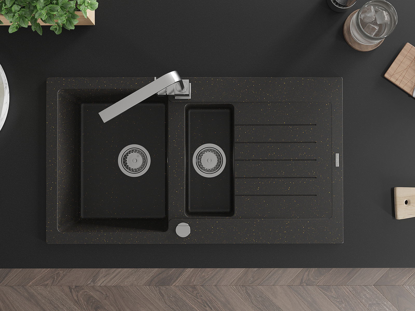 Mexen Matias гранитна мивка с 1,5 камери с отцедник и кухненски смесител Rita, черен/златен - 6502-75-670300-00