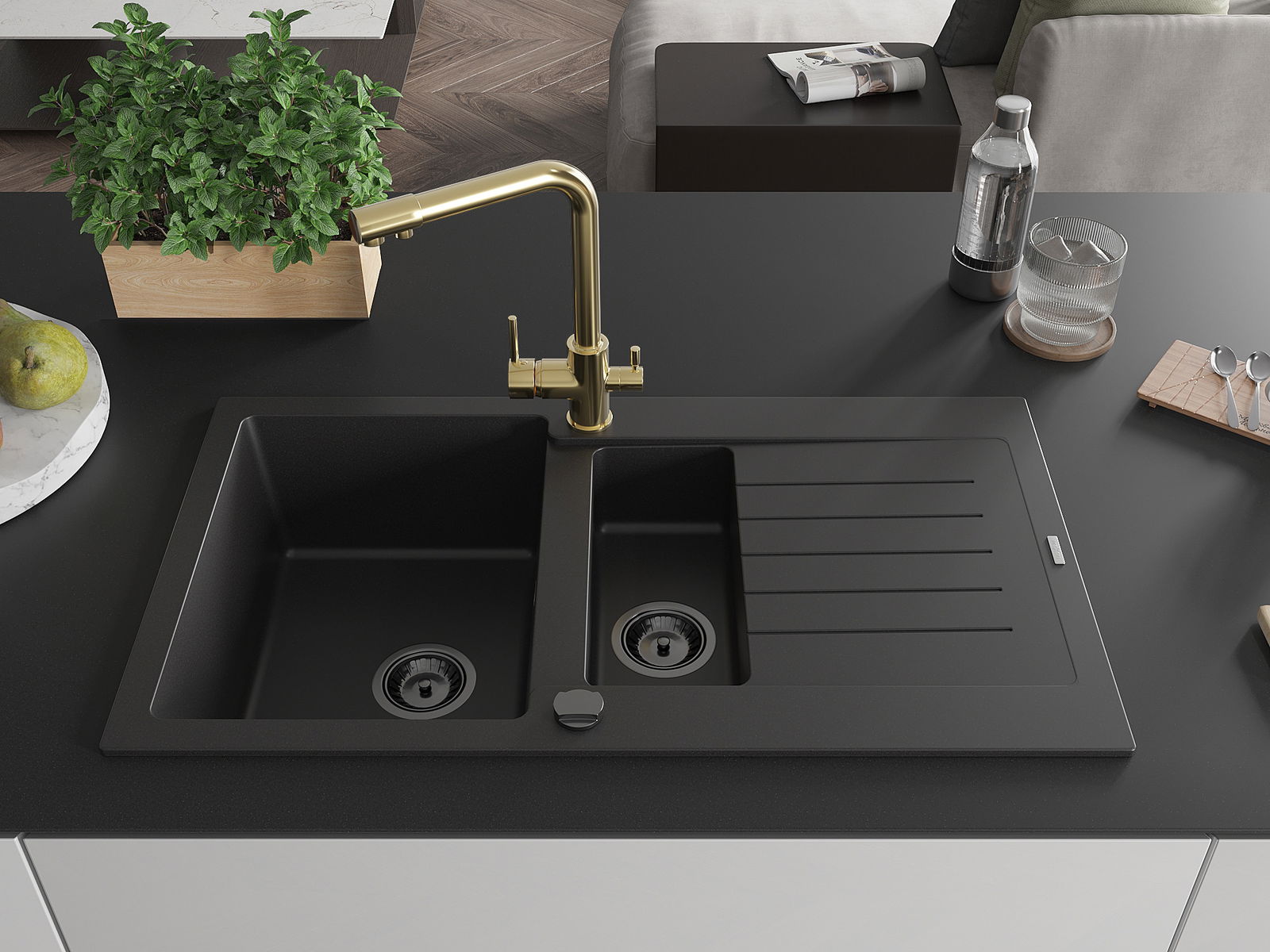 Мивката е направена от висококачествен гранит. Това е елегантно и най -вече практично допълнение към всяка кухня, независимо от нейния стил. Висококачествената и гранитна издръжливост осигуряват много години употреба.