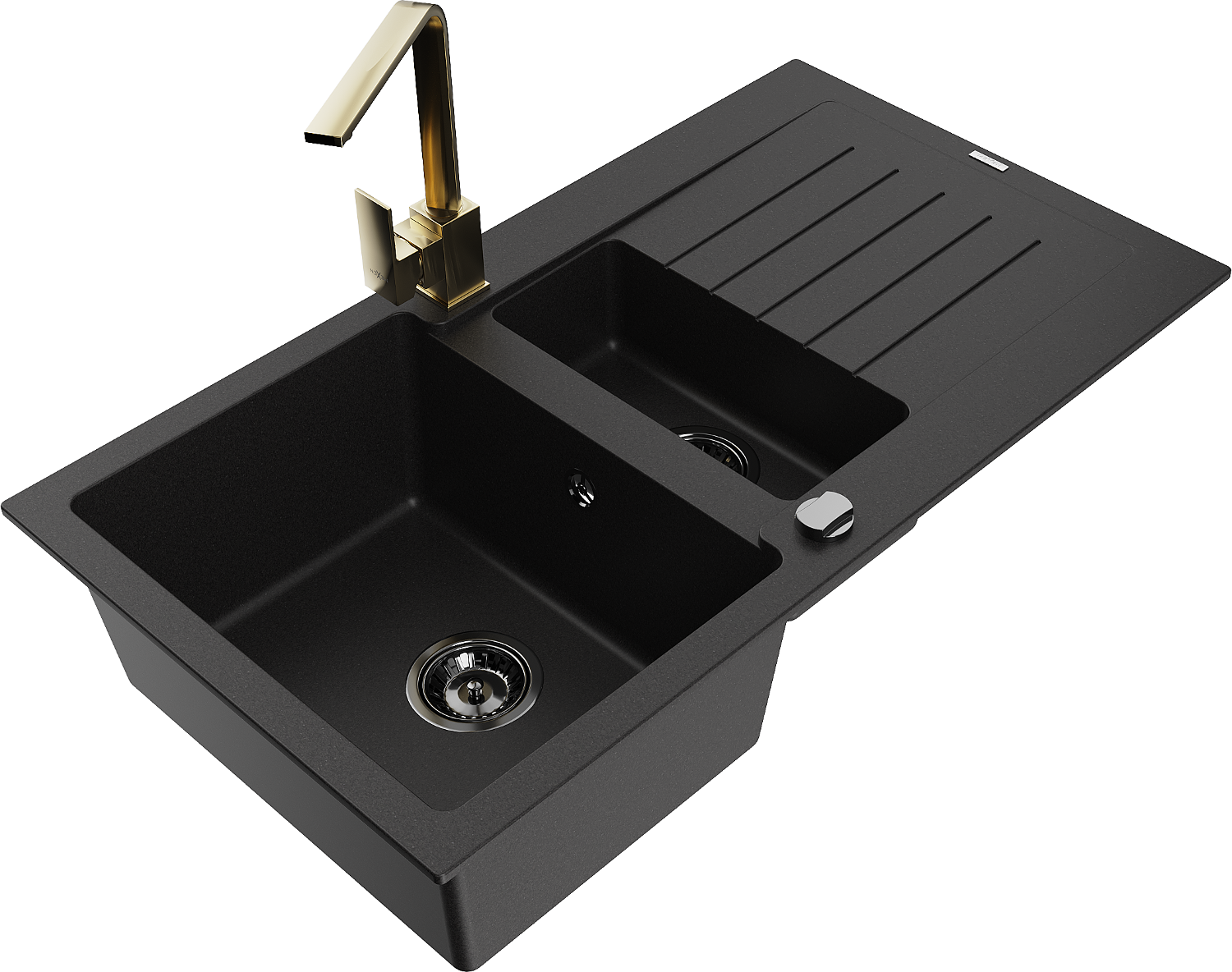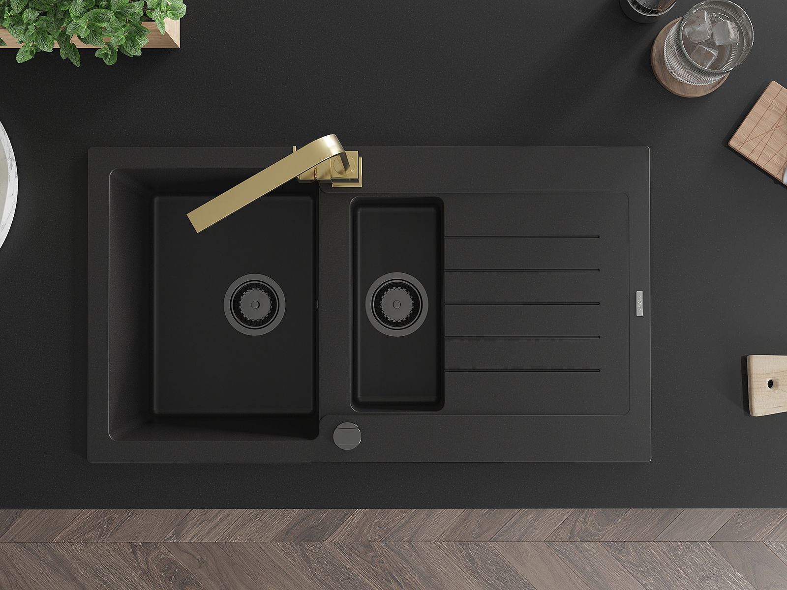 Mexen Matias гранитна кухненска мивка с 1.5 камери с отцедник и кухненска батерия Rita, черна - 6502-77-670300-50-B