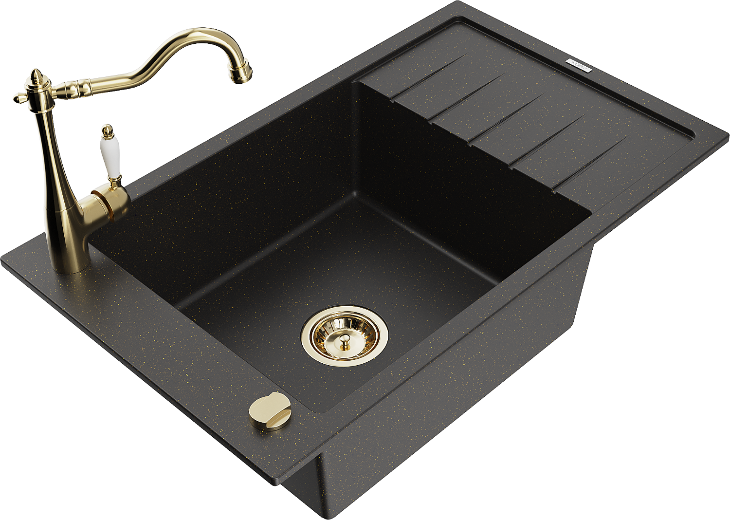 Mexen Elias гранитна мивка 1-камерна с отцедник и кухненски смесител Carla, черен/златен металик - 6511-75-670700-50