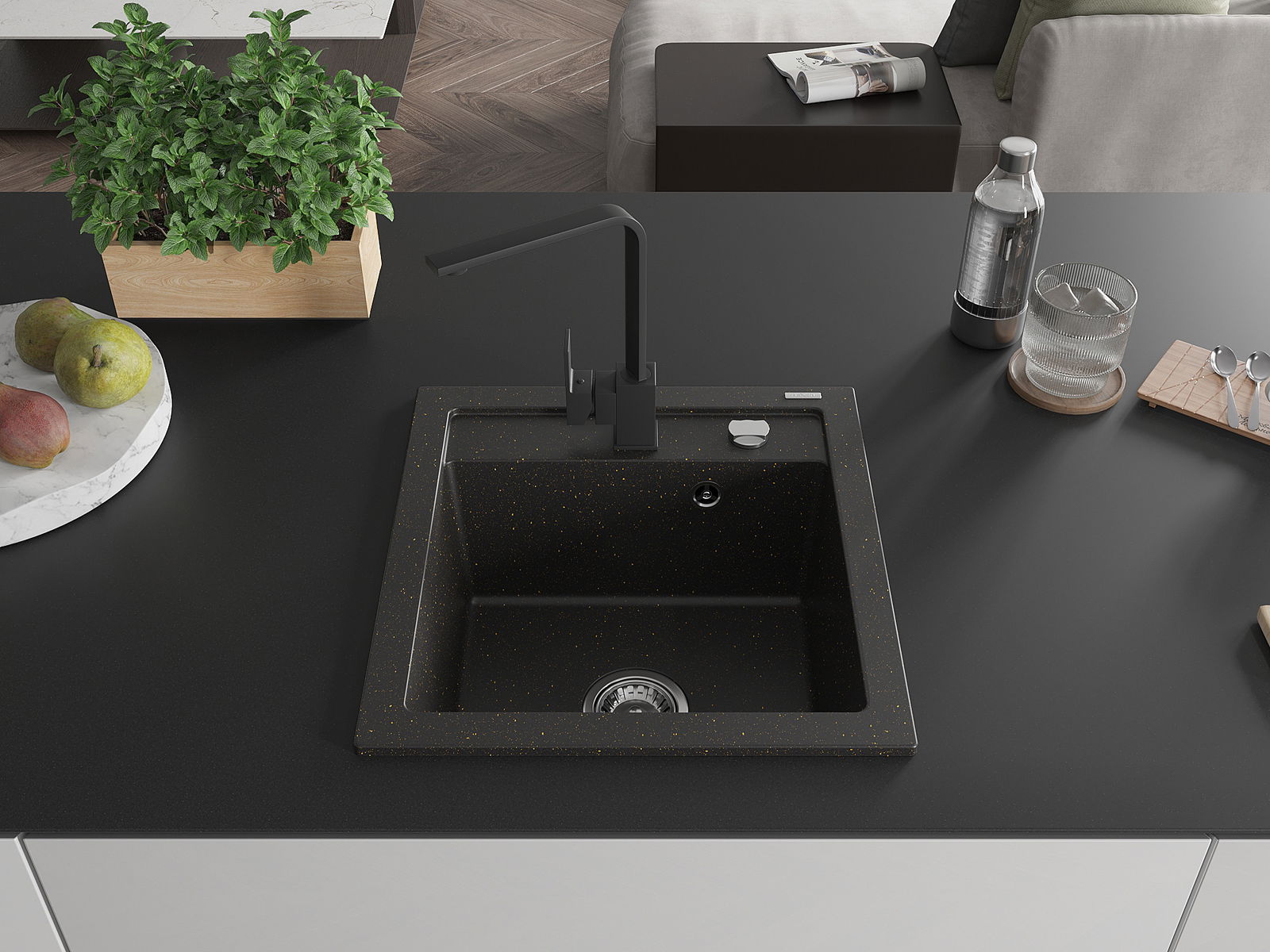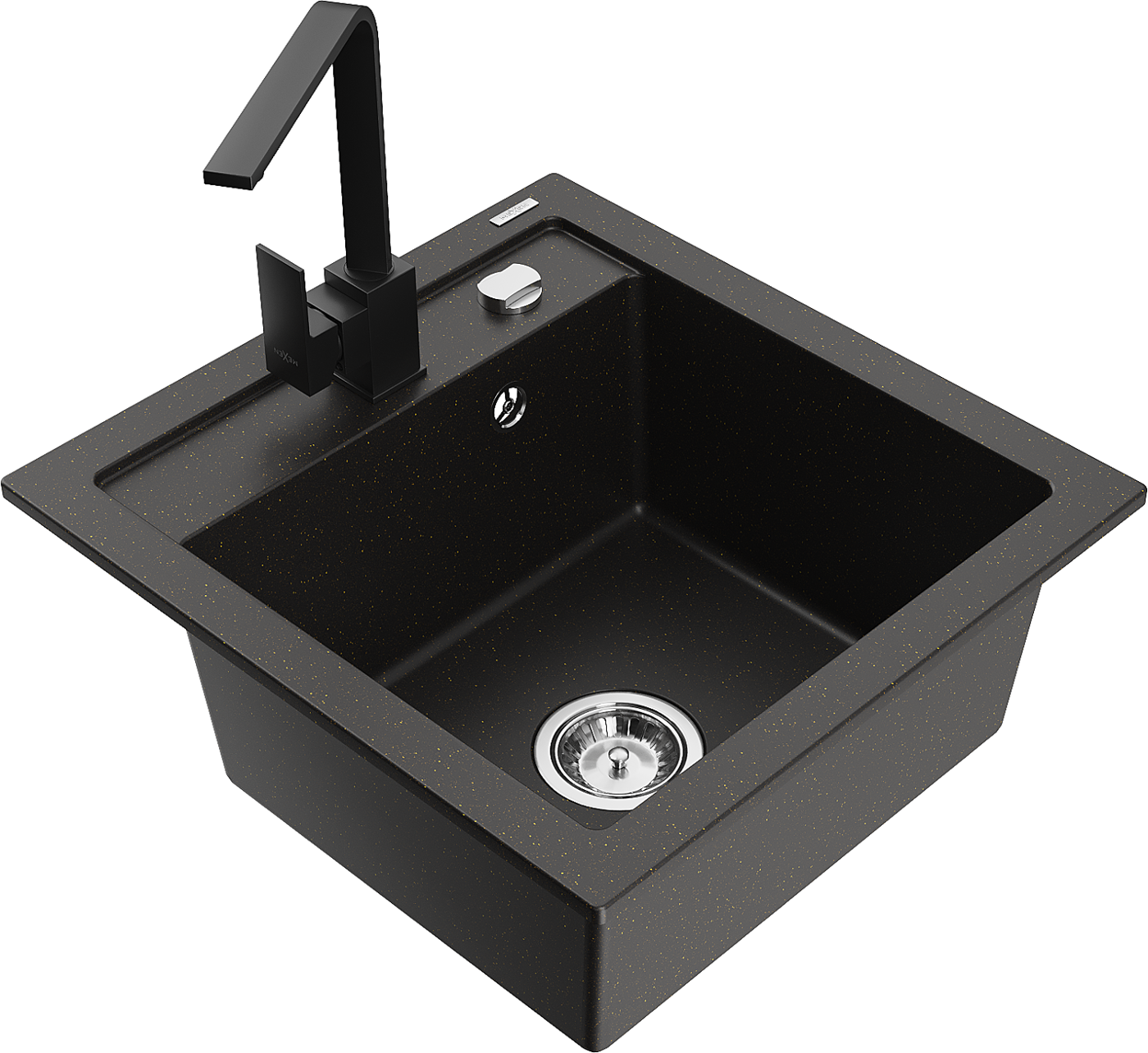 Mexen Vito гранитна кухненска мивка 1-коморова с кухненски смесител Rita, черен/златист металик - 6503-75-670300-70