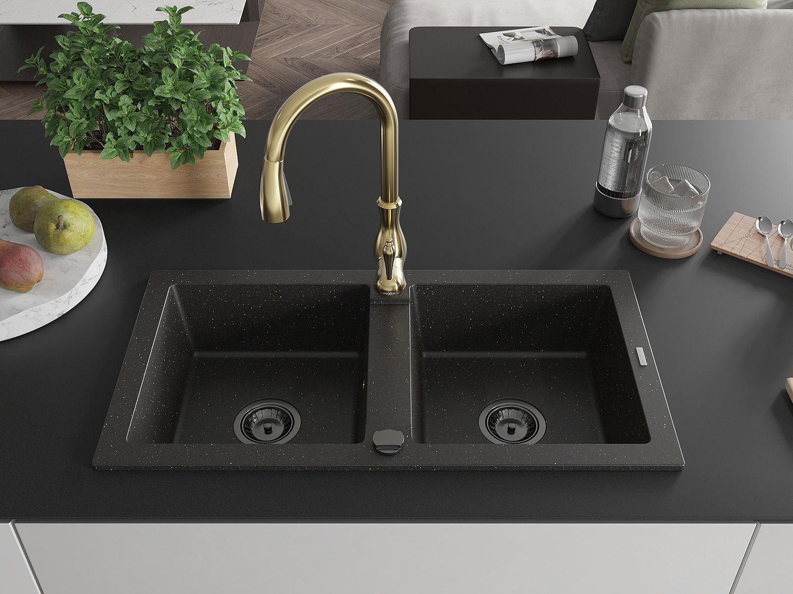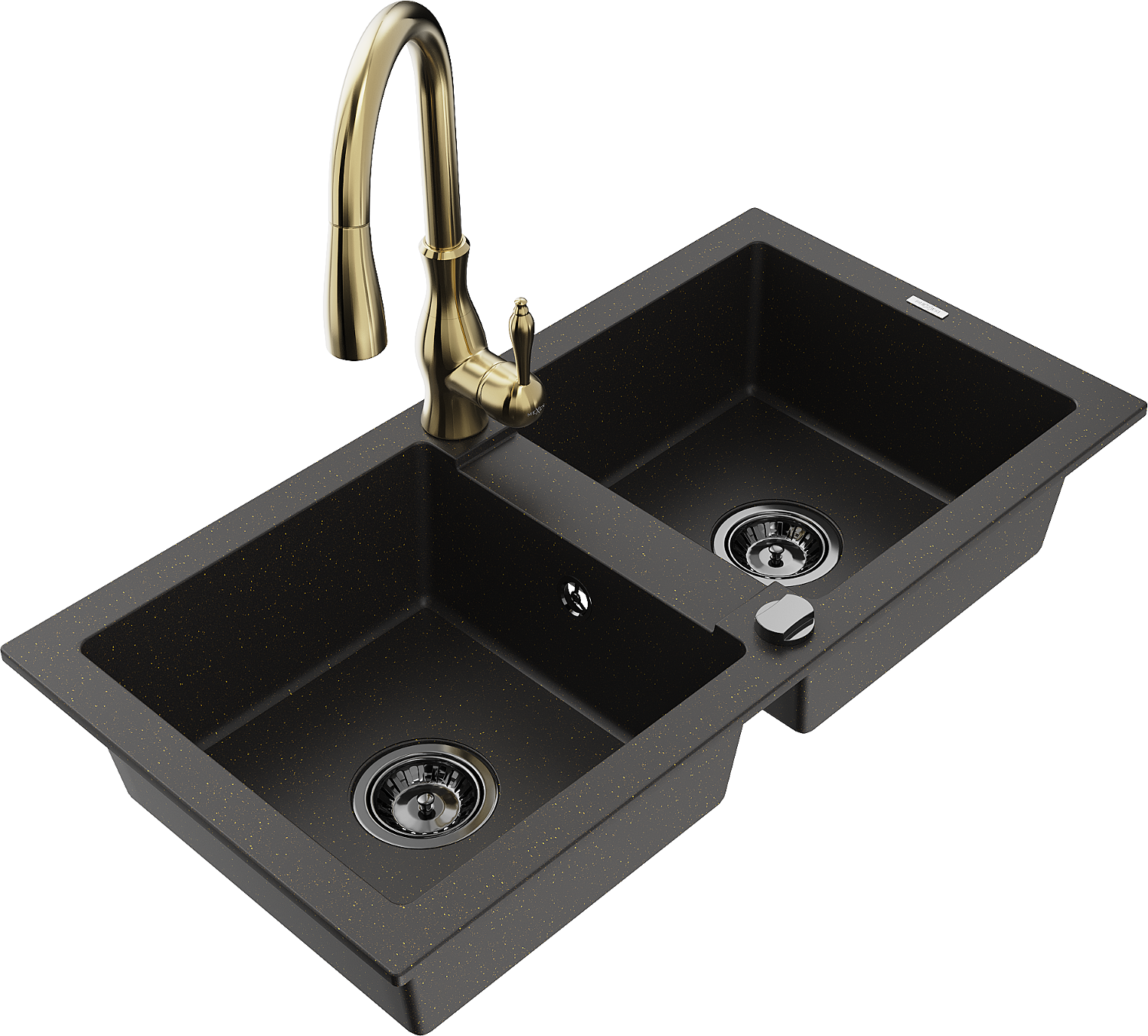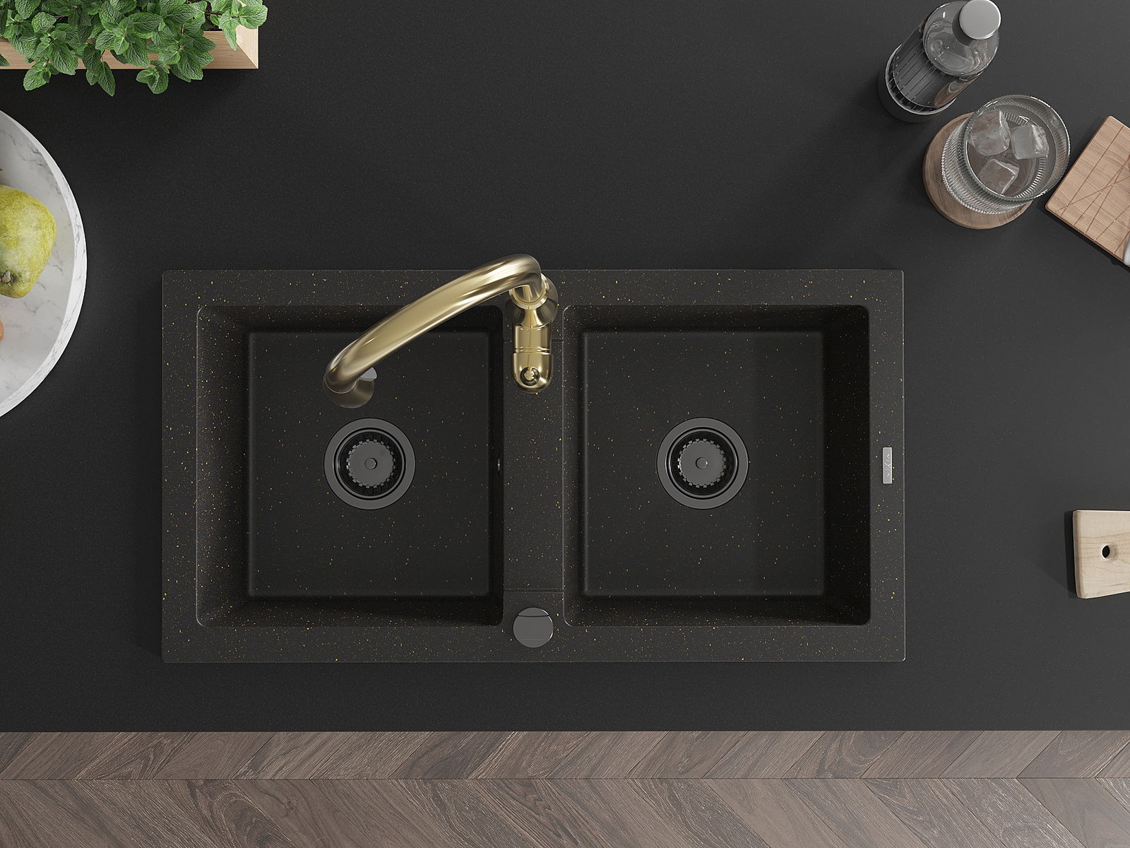 Mexen Mario гранитна кухненска мивка с 2 камери и кухненски смесител Savita, черен/златист металик - 6504-75-672601-50-B