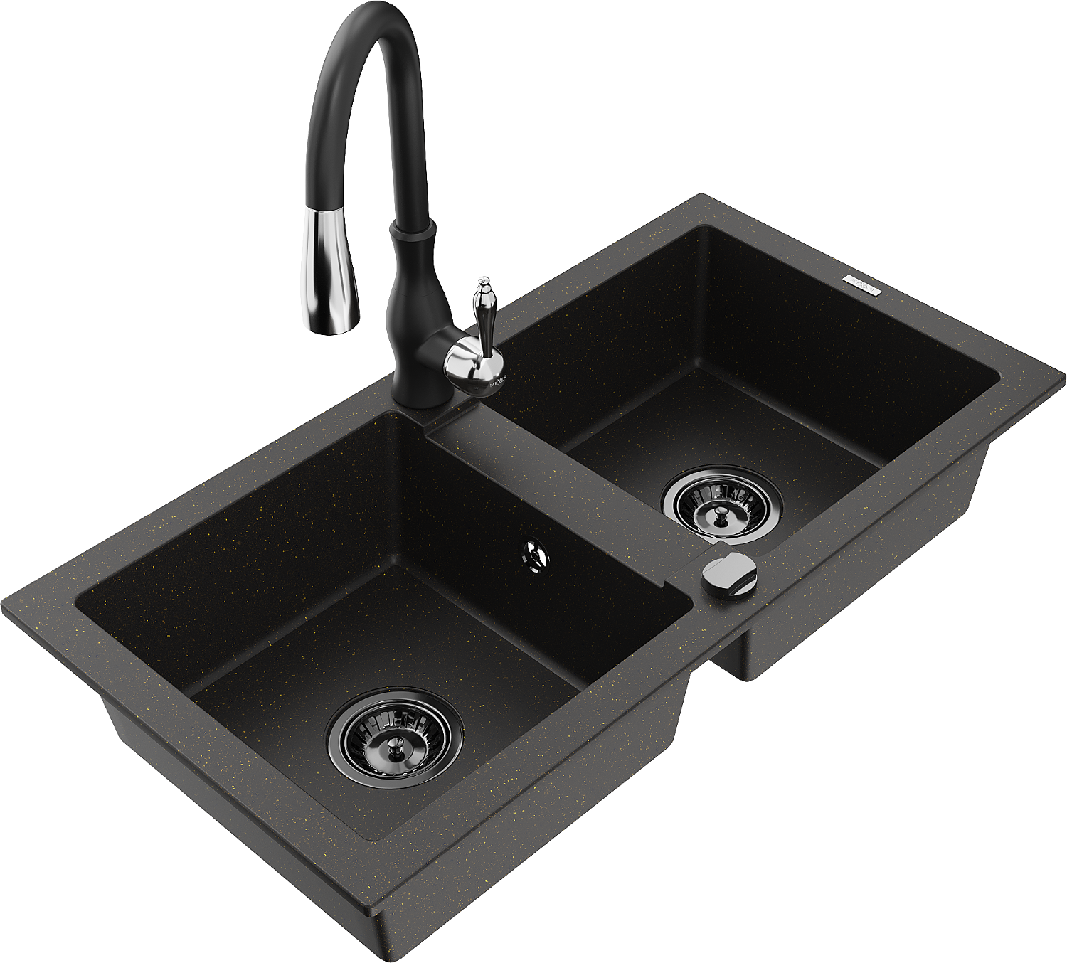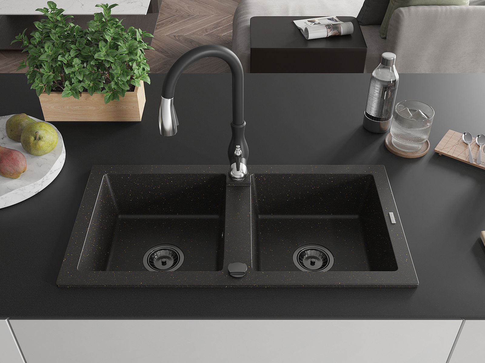 Mexen Mario гранитна кухненска мивка с 2 отделения и кухненски смесител Savita, черен/златен металик - 6504-75-672601-70-B