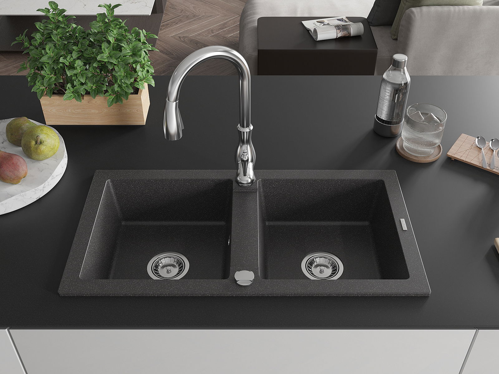 Mexen Mario гранитна мивка с 2 камери и кухненски смесител Savita, черен на пръски - 6504-76-672601-00