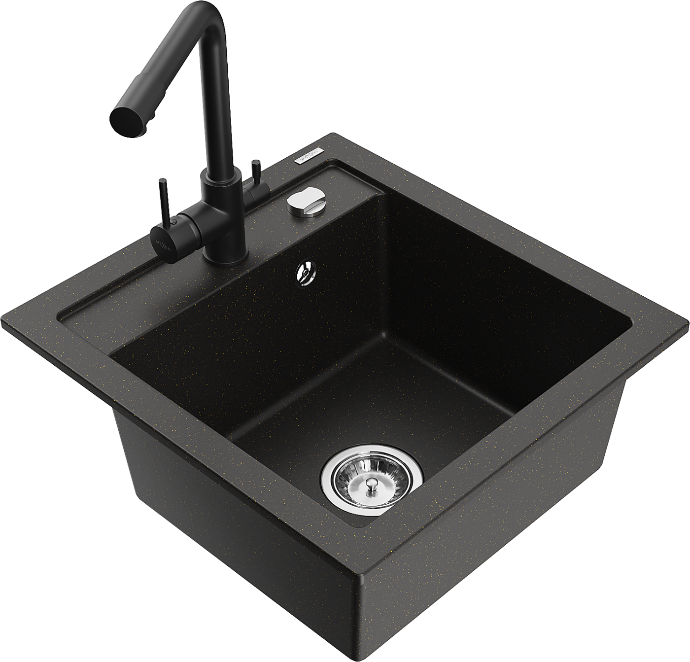 Mexen Vito гранитна кухненска мивка с 1 отделение с кухненски смесител Duero, черен/златен металик - 6503-75-671600-70