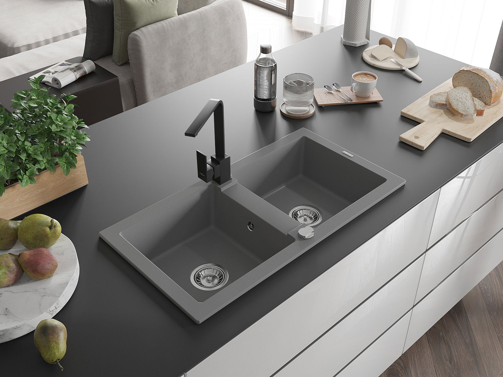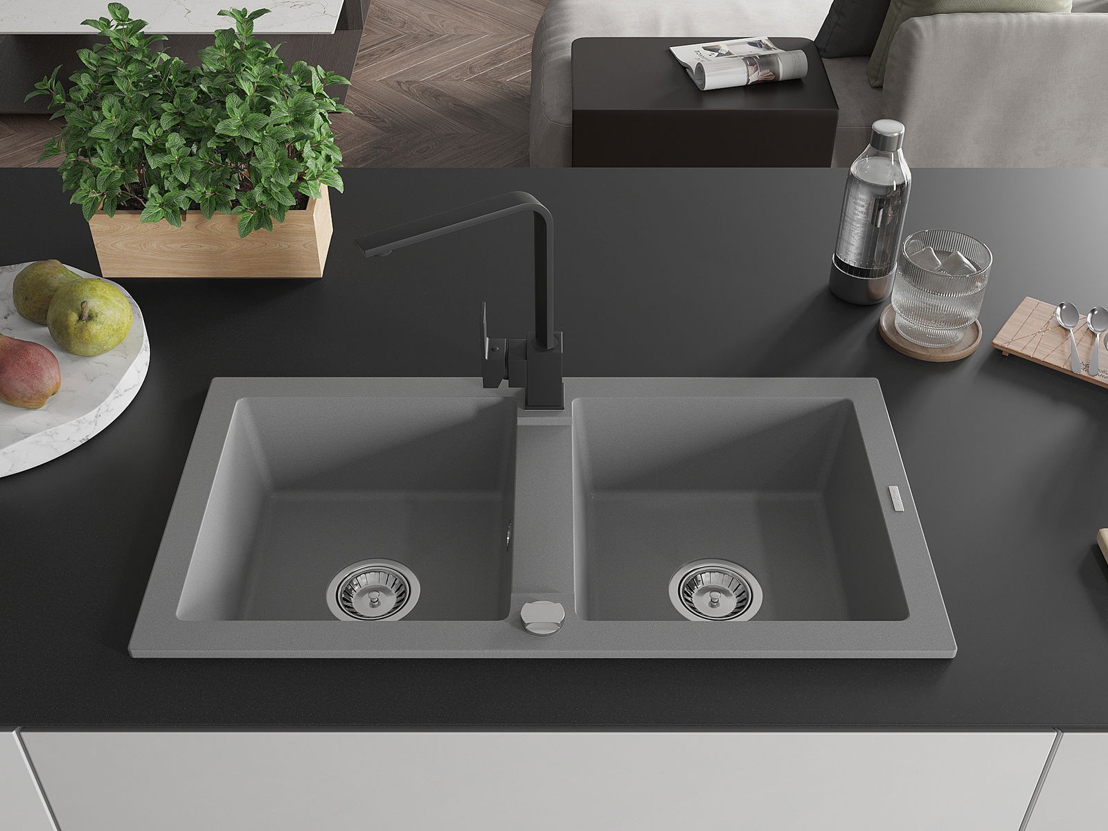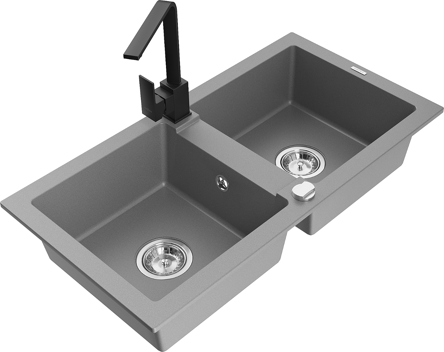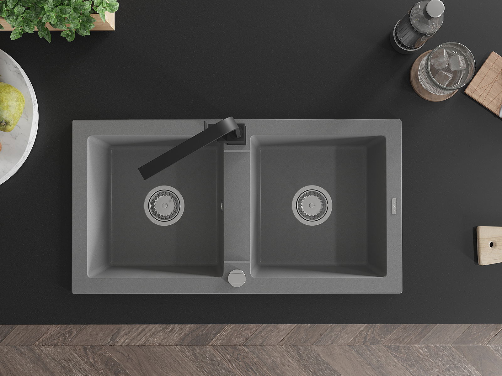 Mexen Mario гранитна мивка с два басейна и кухненски смесител Rita, сив - 6504-71-670300-70