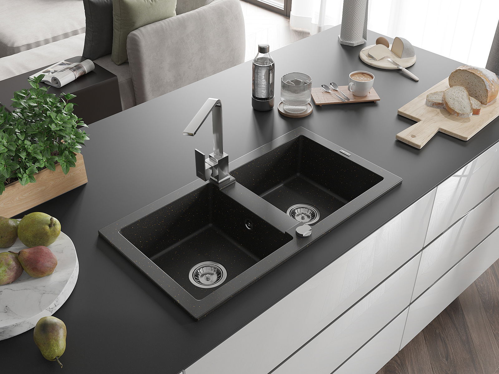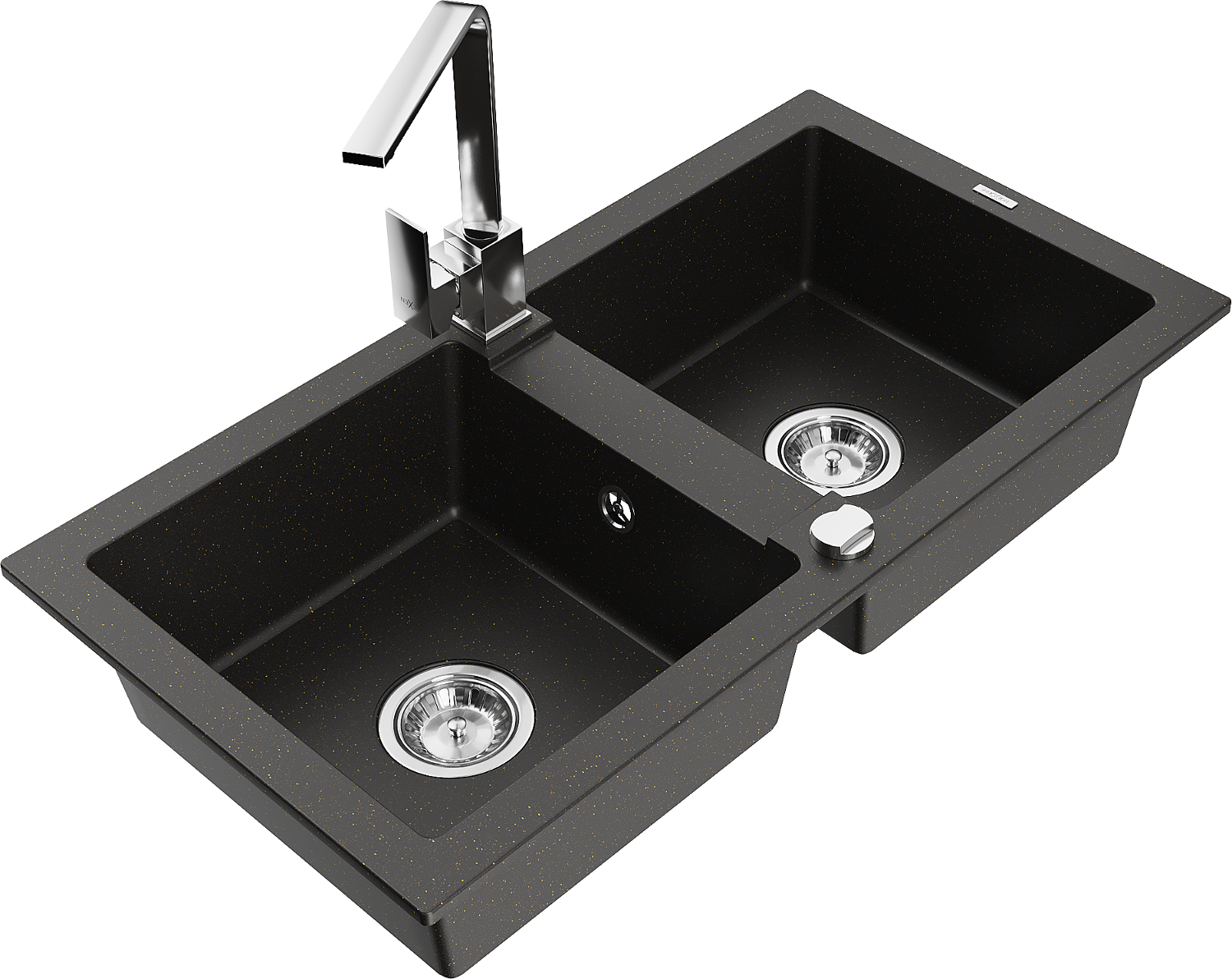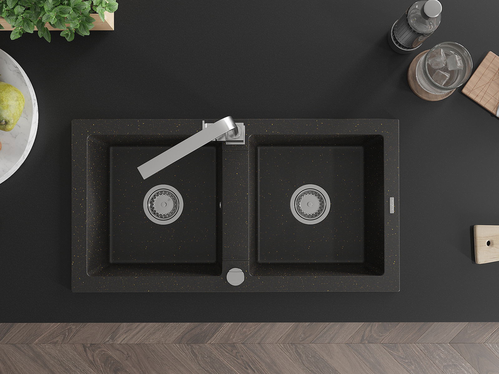 Mexen Mario кухненска мивка гранитна 2-коморова с кухненски смесител Rita, черен/златист металик - 6504-75-670300-00