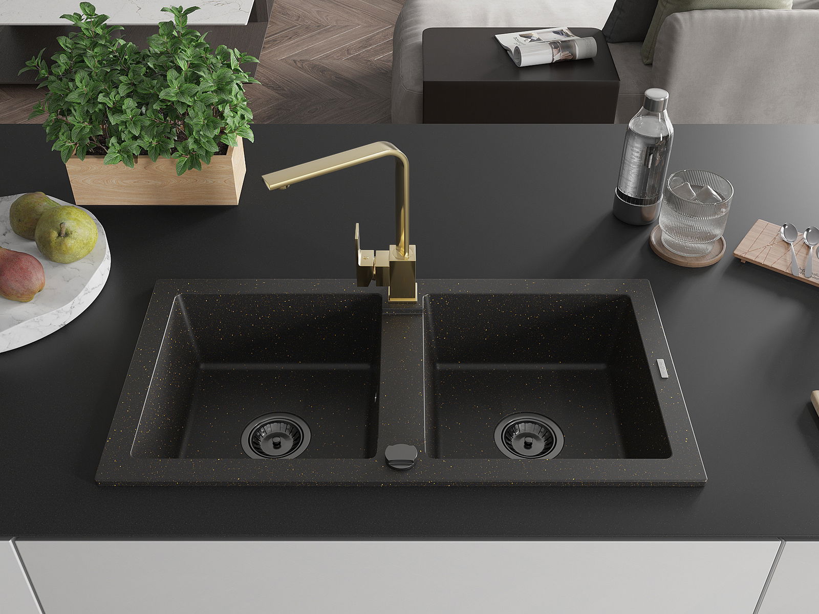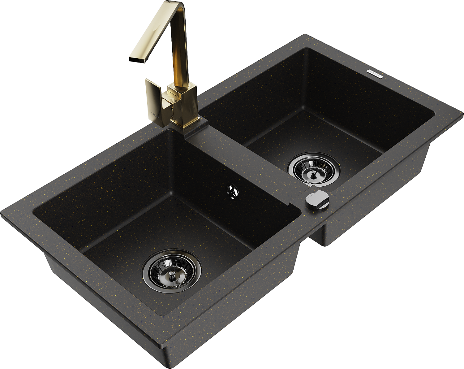 Mexen Mario Гранитна мивка с 2 камери с кухненски смесител Rita, черно/златен металик - 6504-75-670300-50-B