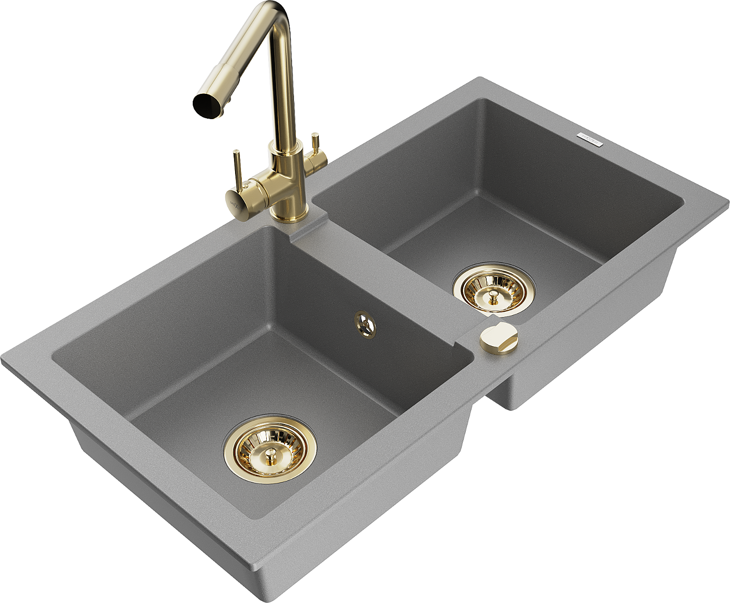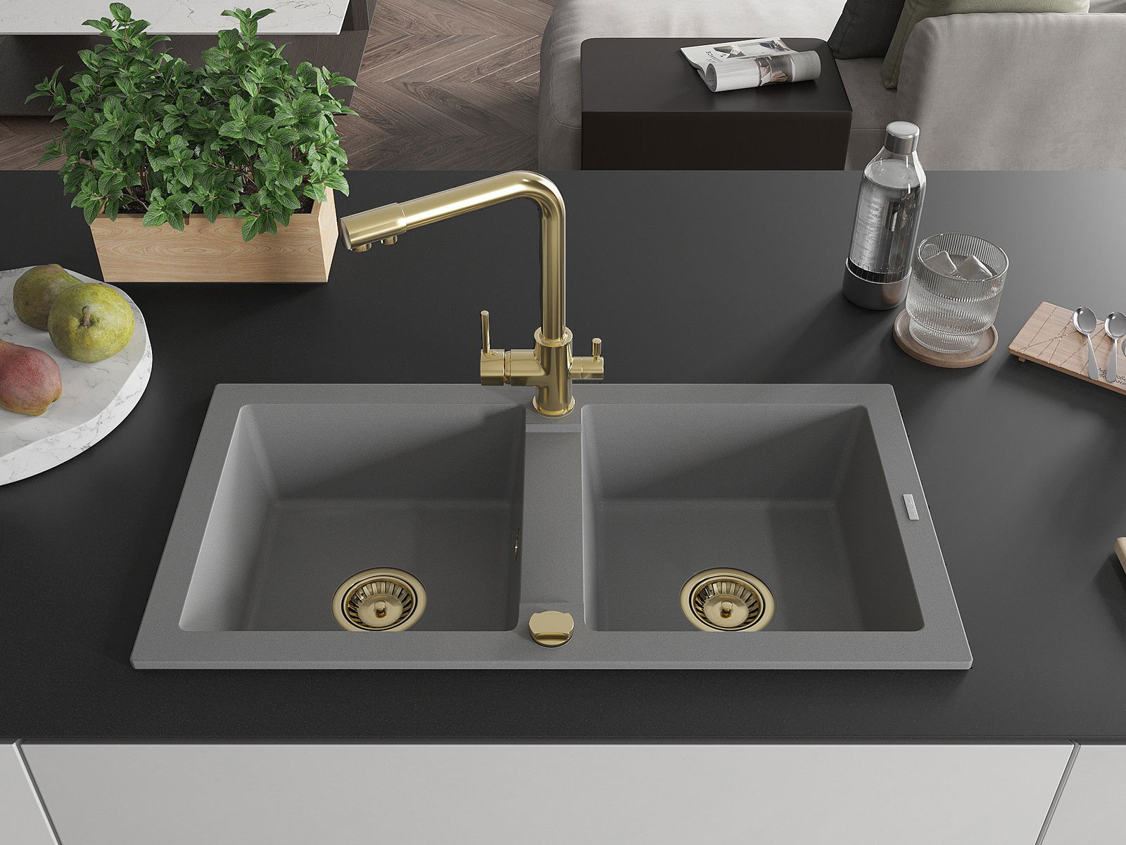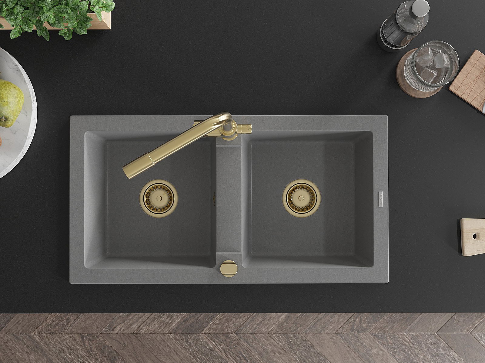 Mexen Mario двойна кухненска мивка от гранит с кухненски смесител Duero, сива