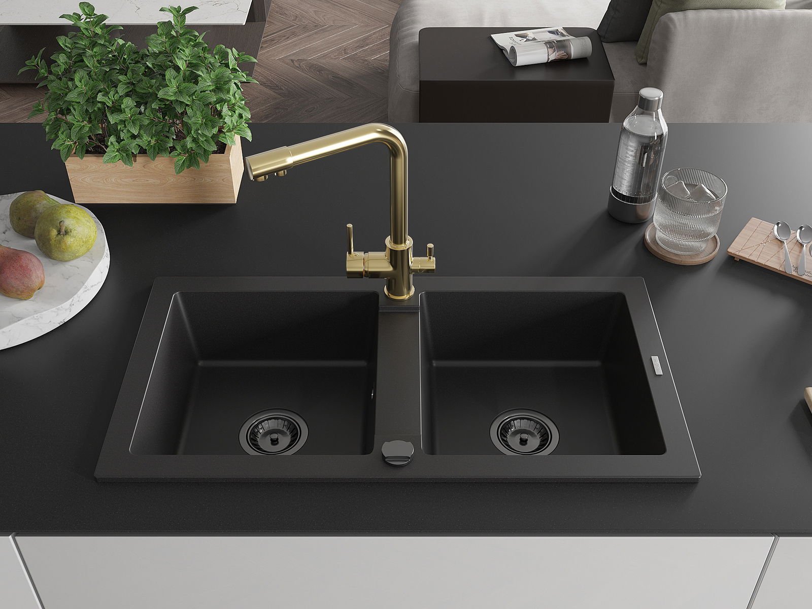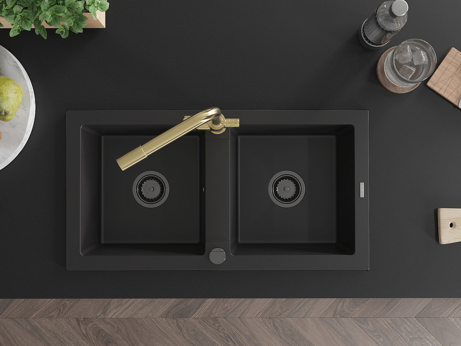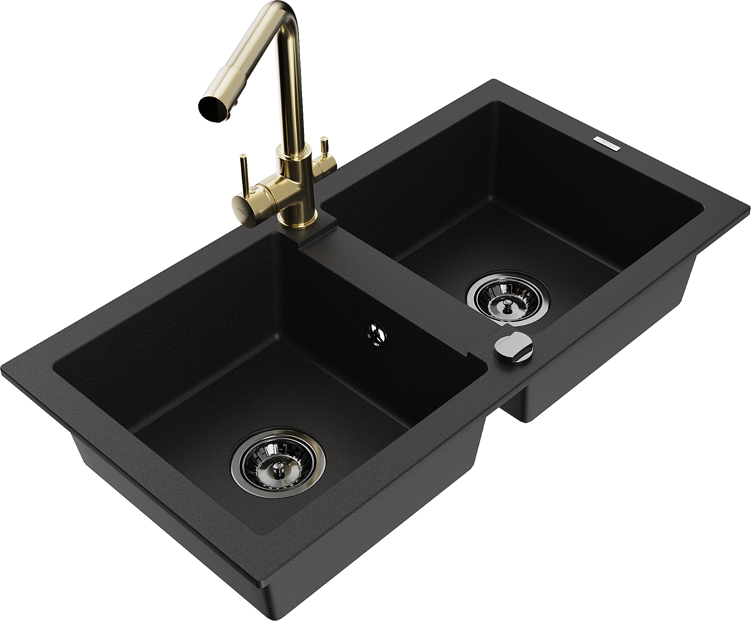 Mexen Mario гранитна мивка с 2 камери и кухненски смесител Duero, черен - 6504-77-671600-50-B