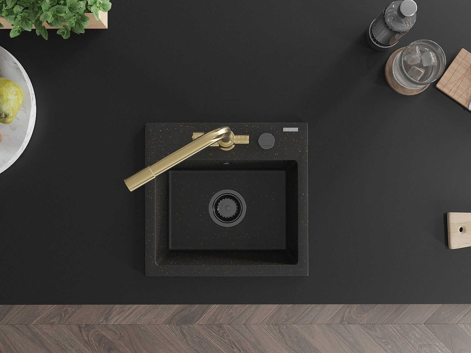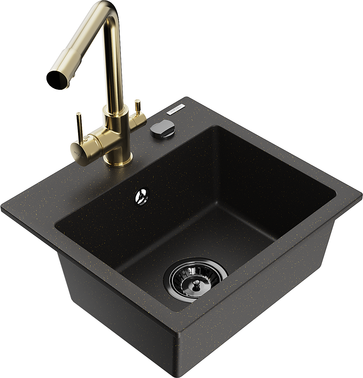 Mexen Milo гранитна кухненска мивка с 1 отделение и кухня батерия Duero, черен/златен металик - 6505-75-671600-50-B