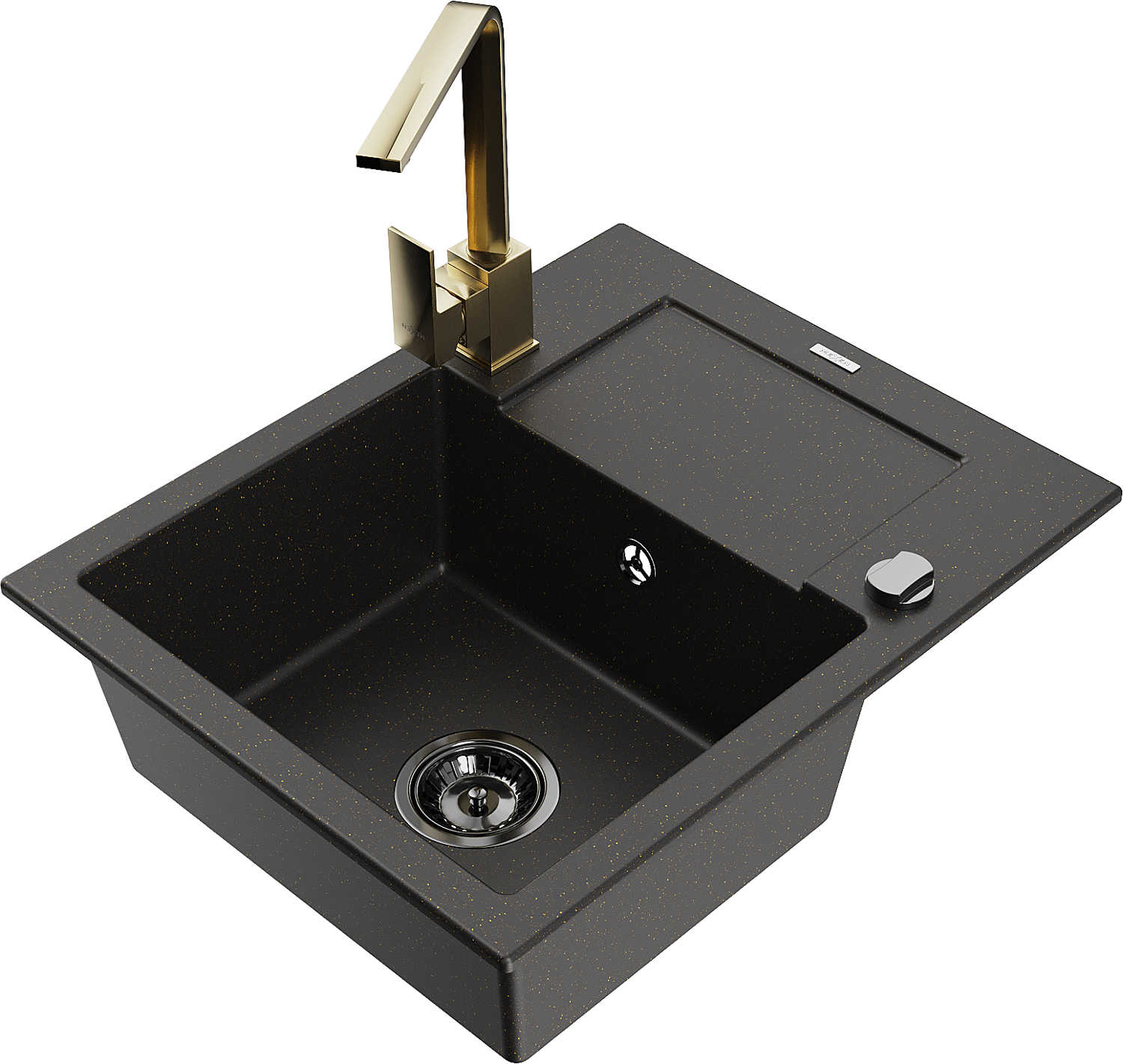 Mexen Enzo гранитна мивка 1-камерна с отцедник и кухненски смесител Rita, черен/златен металик - 6506-75-670300-50-B