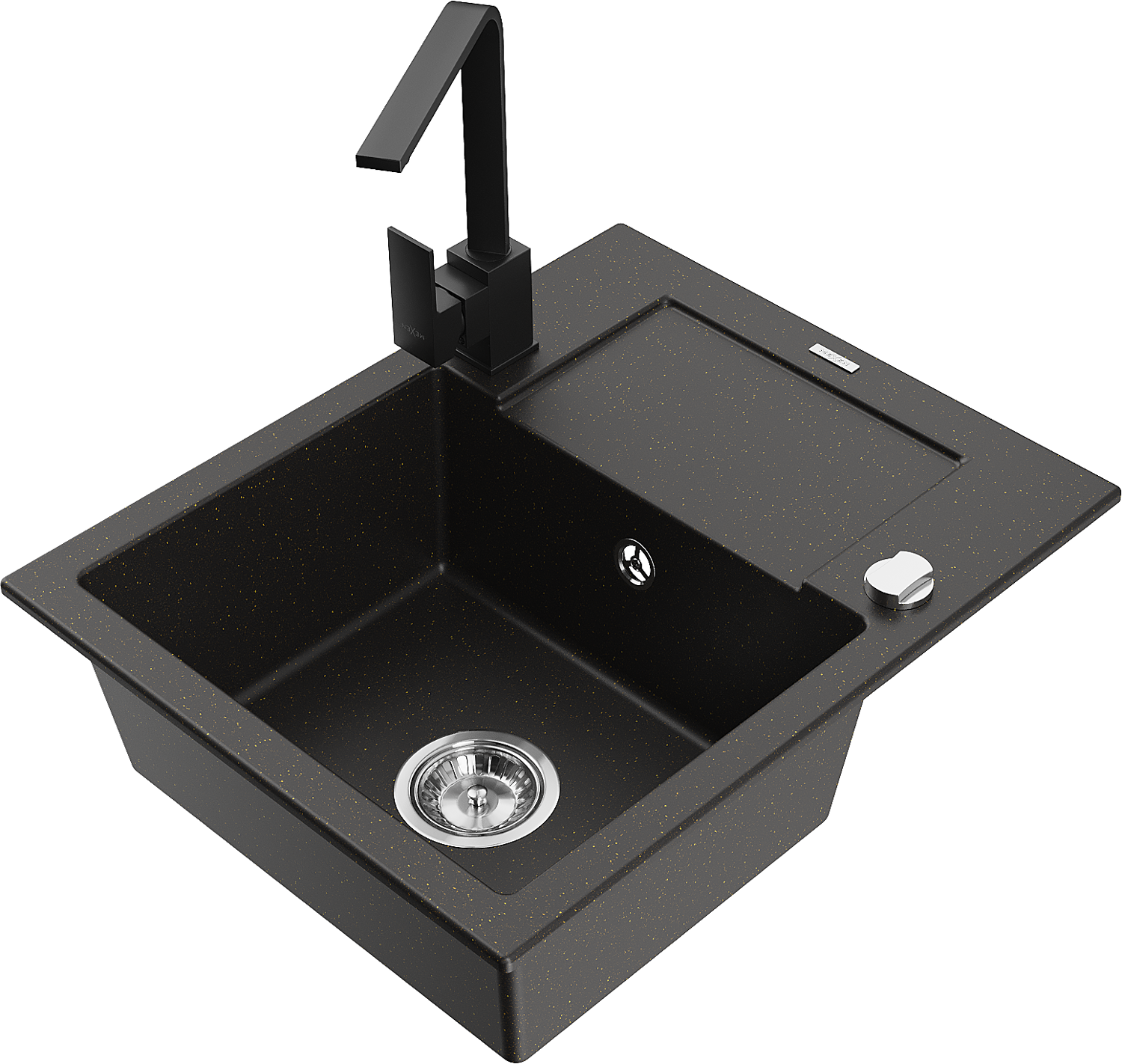 Mexen Enzo гранитна мивка с 1 корито с отцедник и кухненски смесител Rita, черен/златен металик - 6506-75-670300-70