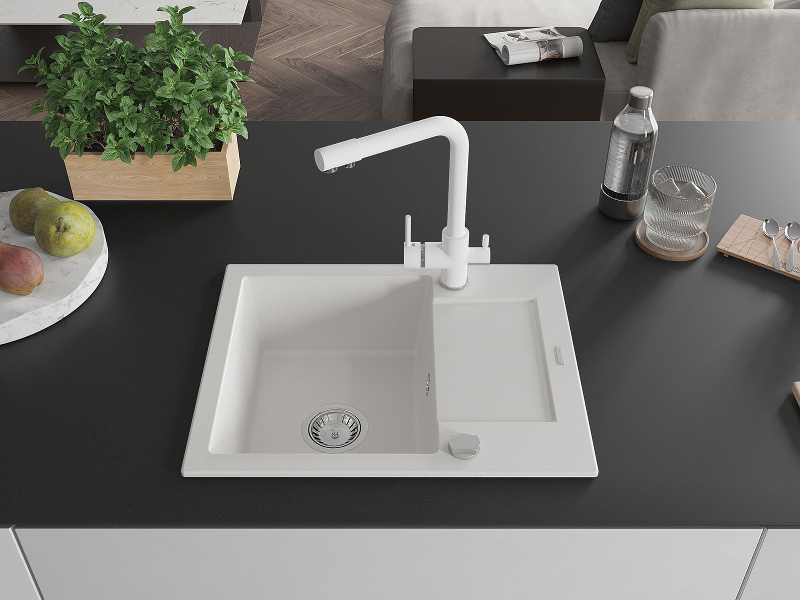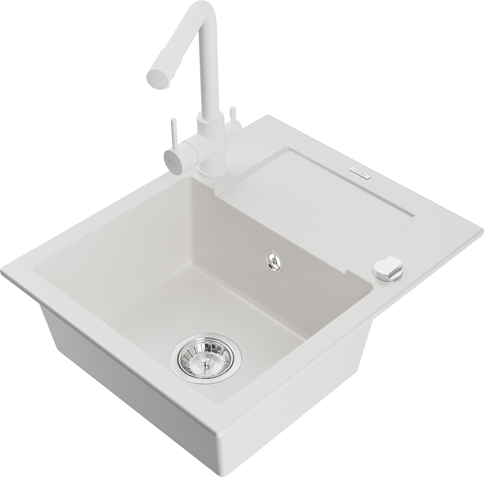 Mexen Enzo кухненска мивка от гранит с 1 отделение с дъска и кухненски смесител Duero, бял - 6506-20-671600-20