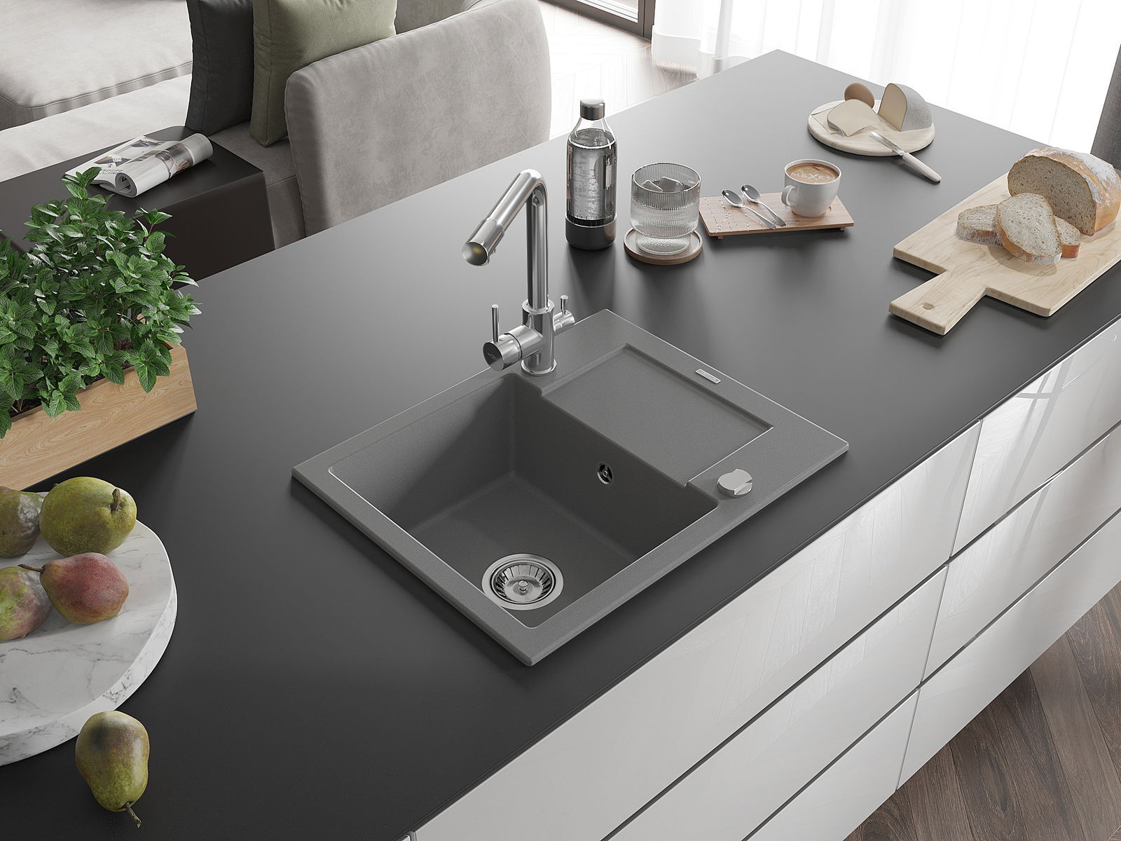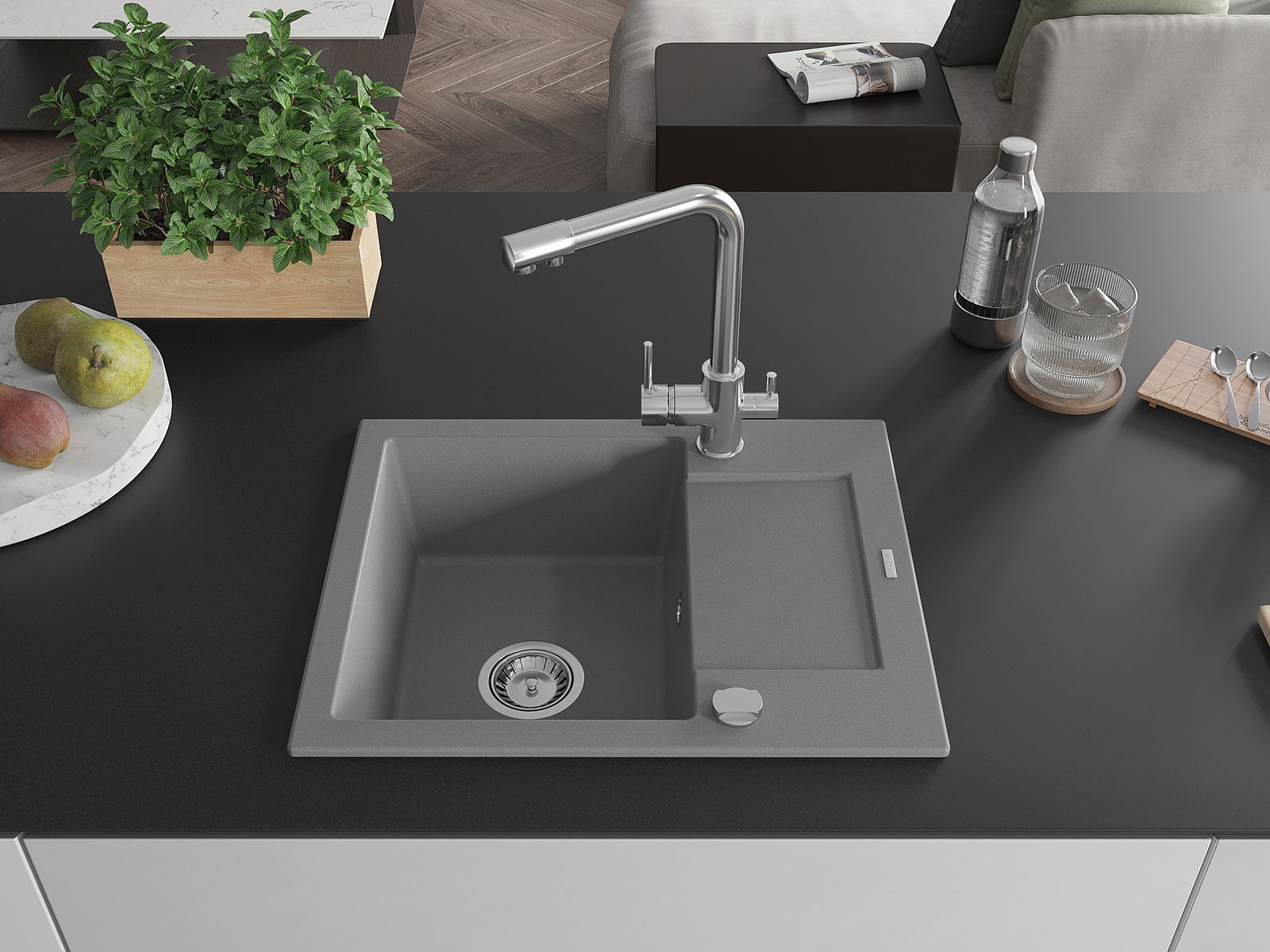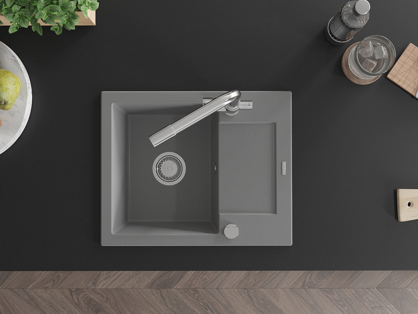 Мивката е направена от висококачествен гранит. Това е елегантно и най -вече практично допълнение към всяка кухня, независимо от нейния стил. Висококачествената и гранитна издръжливост осигуряват много години употреба.