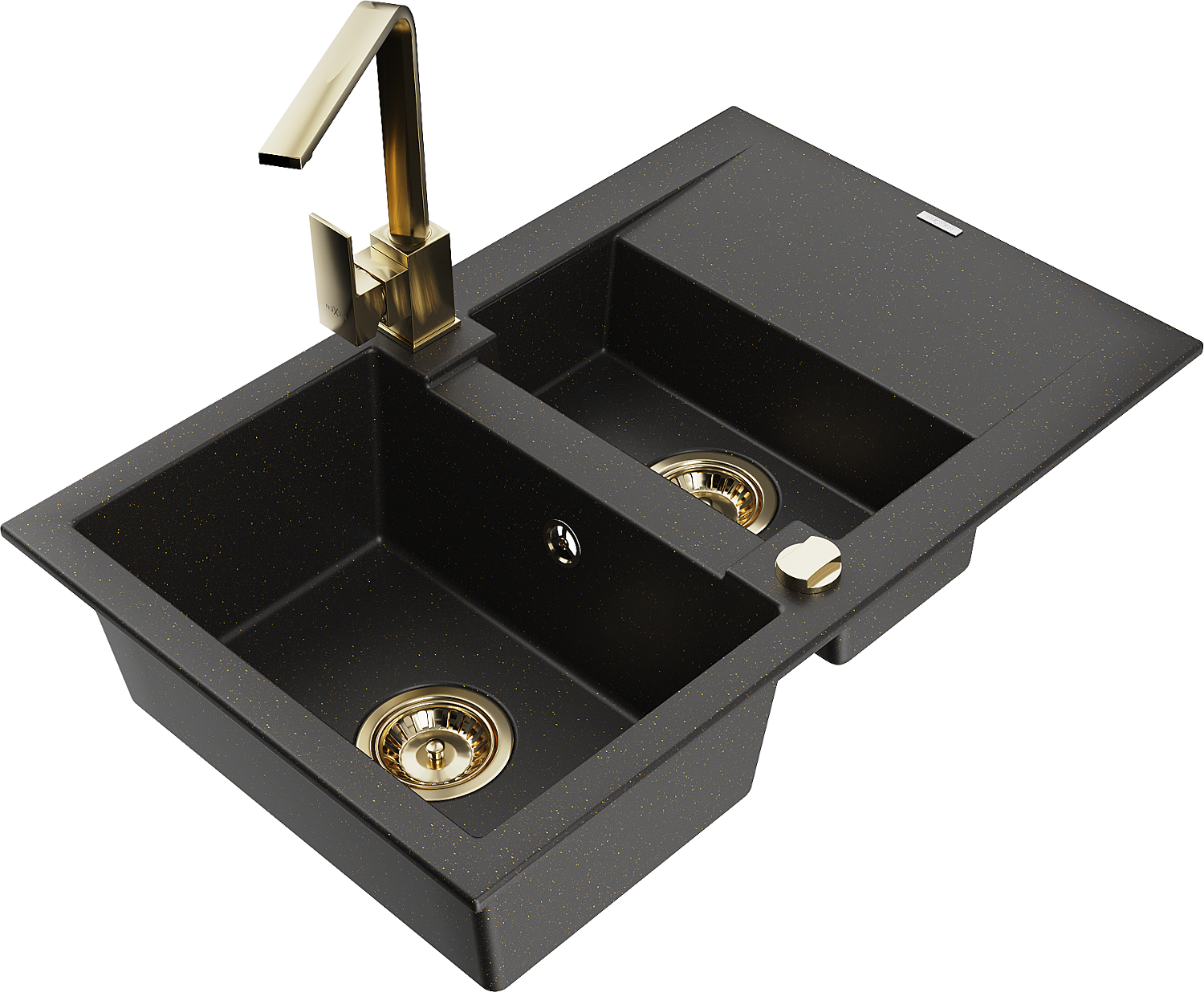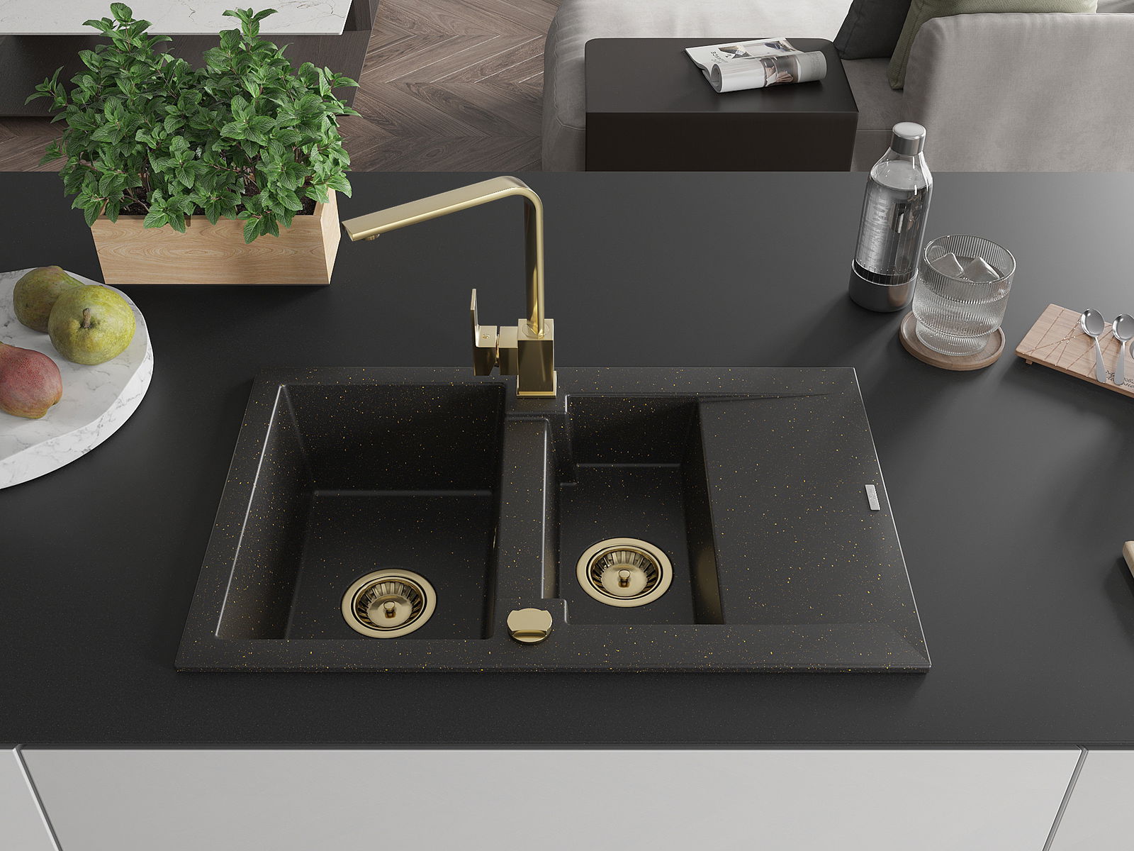 Mexen Gaspar гранитна мивка с 1,5 камери с отцеждащ плот и кухненски смесител Rita, черен/златен - 6507-75-670300-50