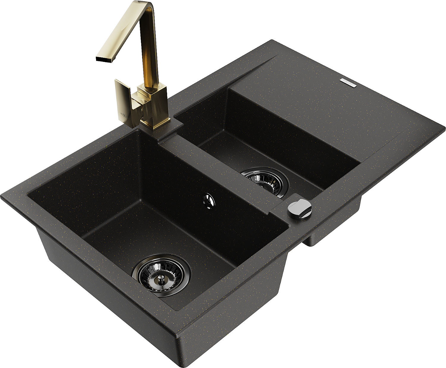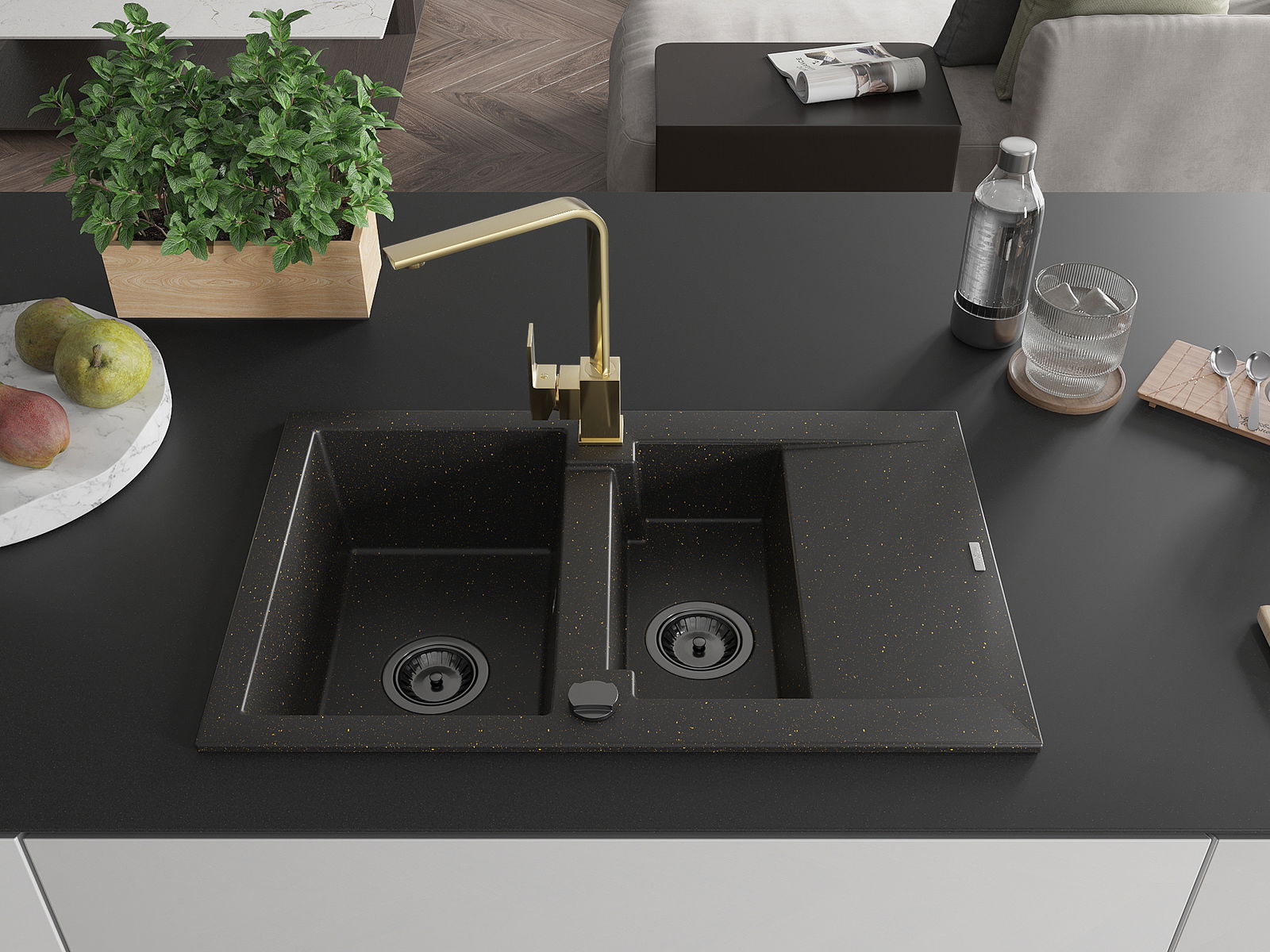 Mexen Gaspar гранитна мивка 1,5-камерна с утаечник и кухненски смесител Rita, черен/златен - 6507-75-670300-50-B