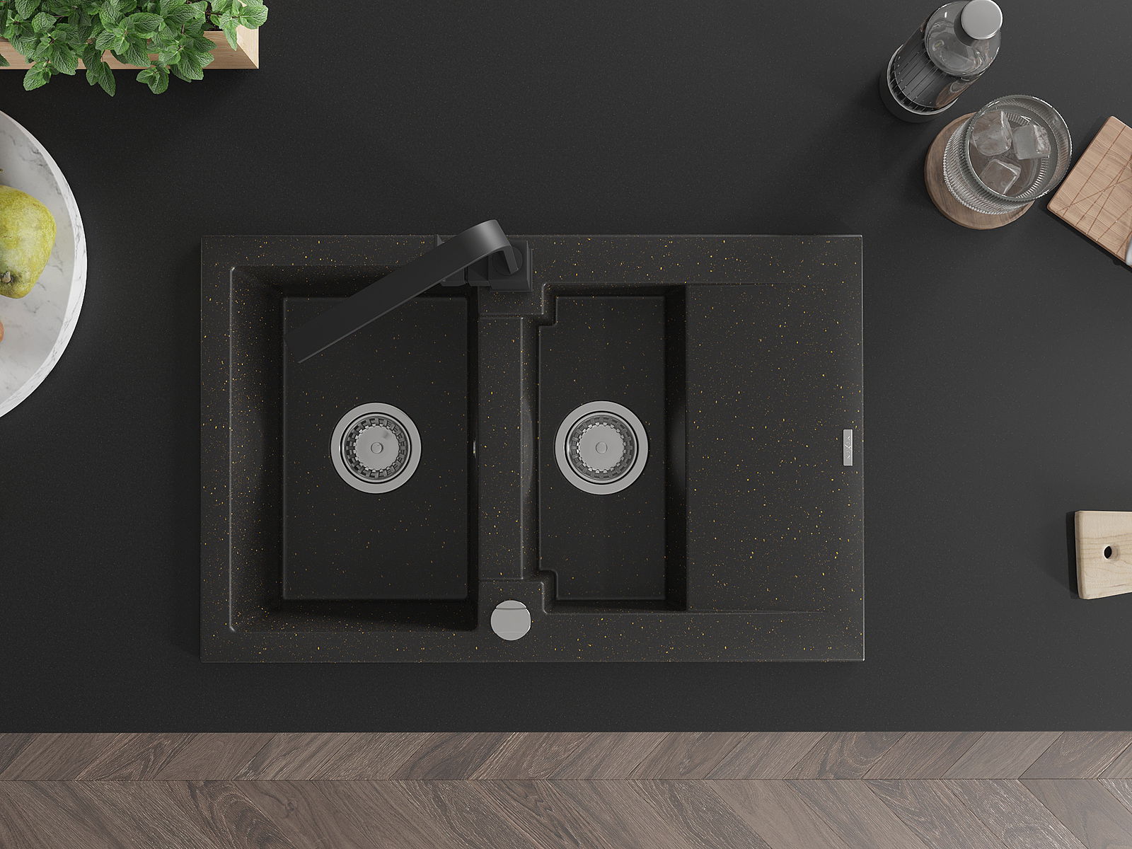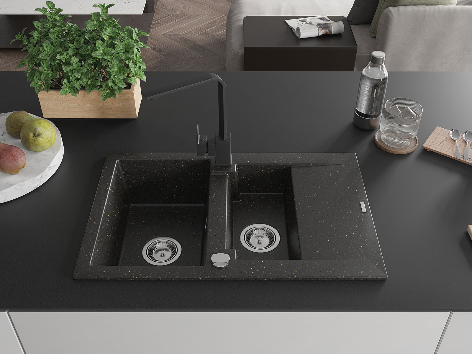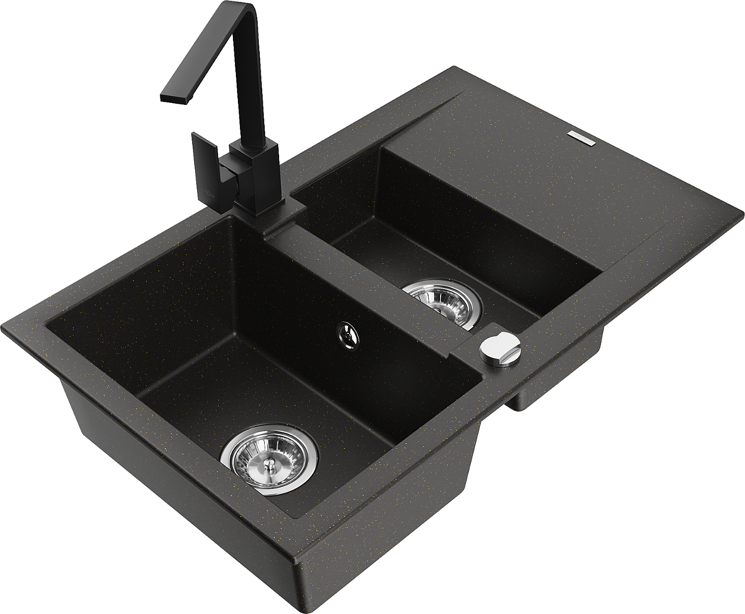 Mexen Gaspar гранитна мивка 1,5-корито с дренаж и кухненски смесител Rita, черен/златист - 6507-75-670300-70
