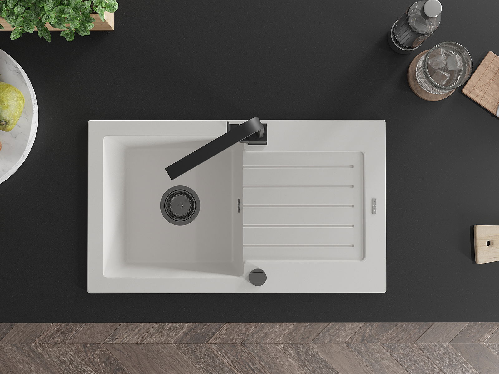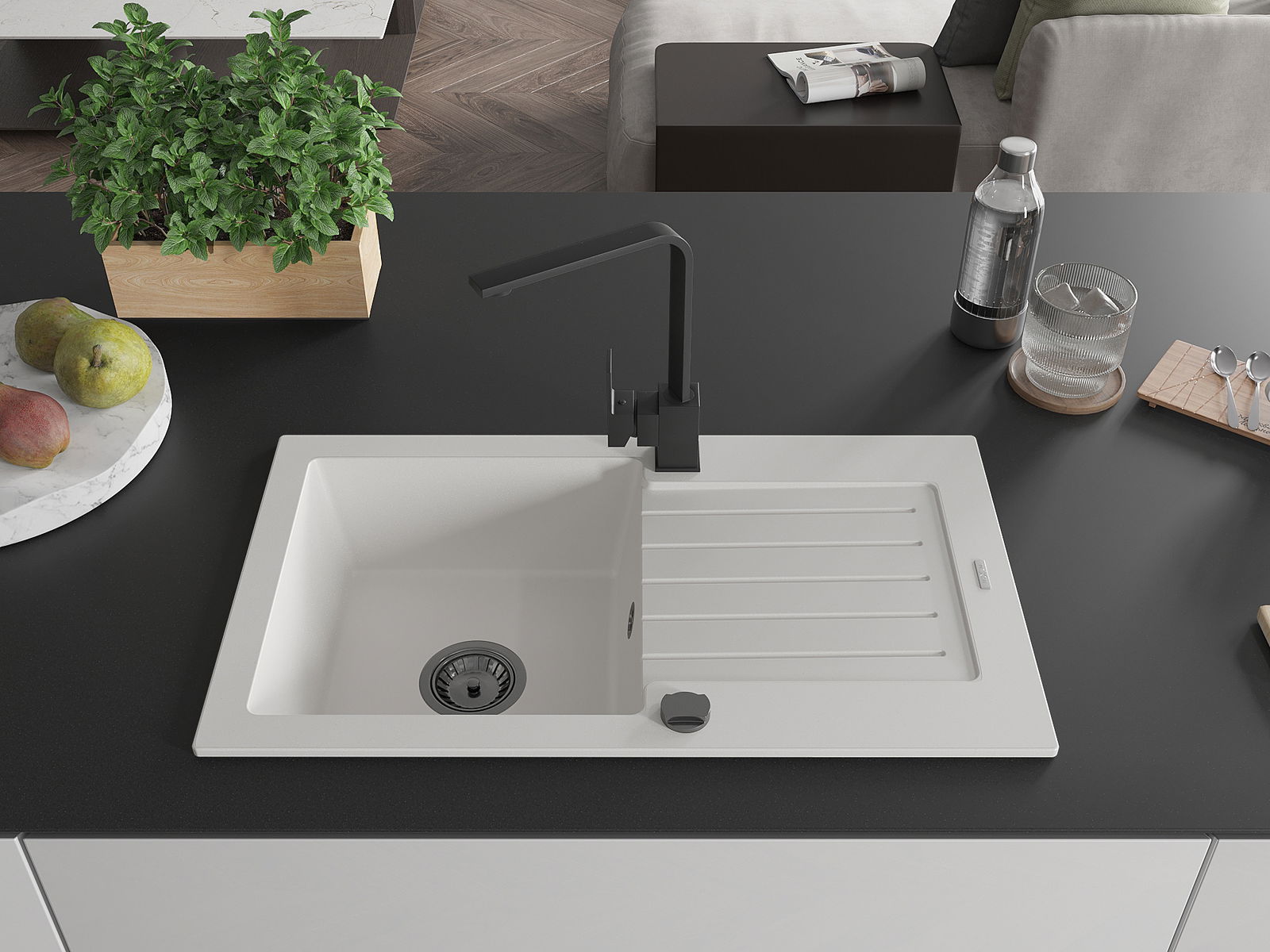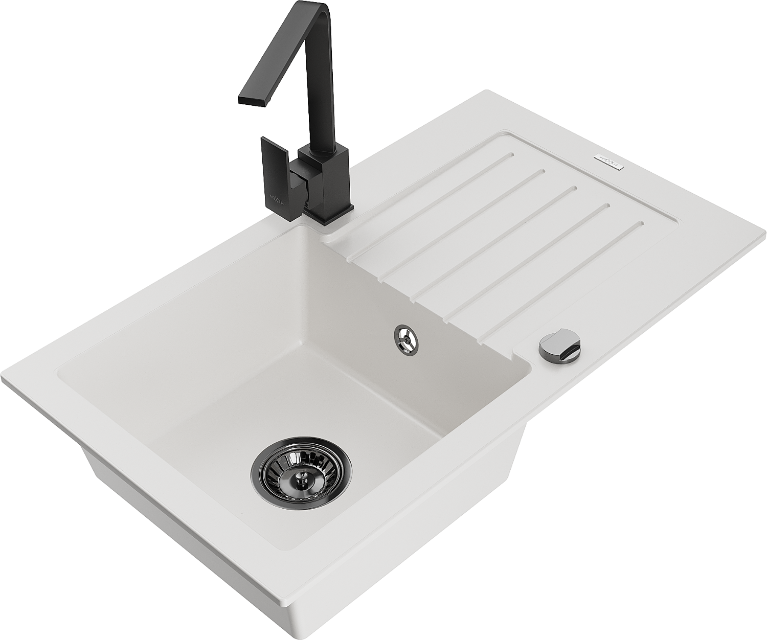 Mexen Pablo Гранитна мивка с 1 отделение с дренаж и кухненски смесител Rita, бял - 6510-20-670300-70