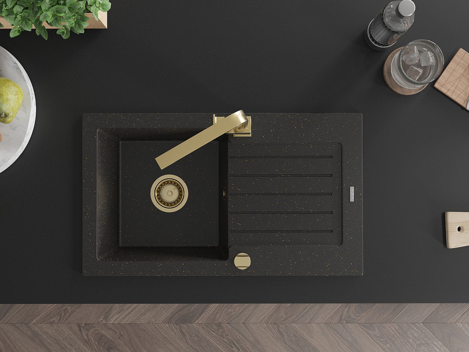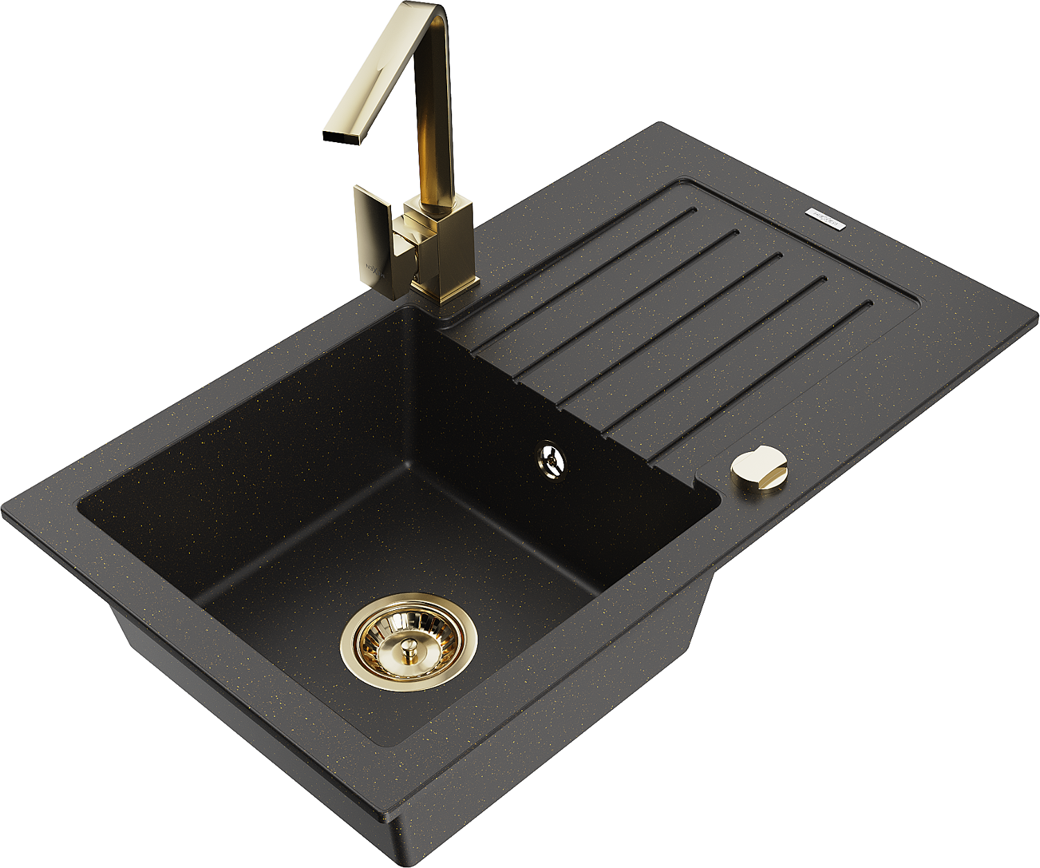 Mexen Pablo гранитна мивка с 1 камера с отцедник и кухненски смесител Rita, черен/златист металик- 6510-75-670300-50