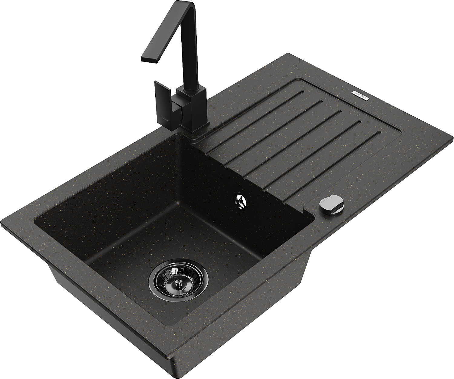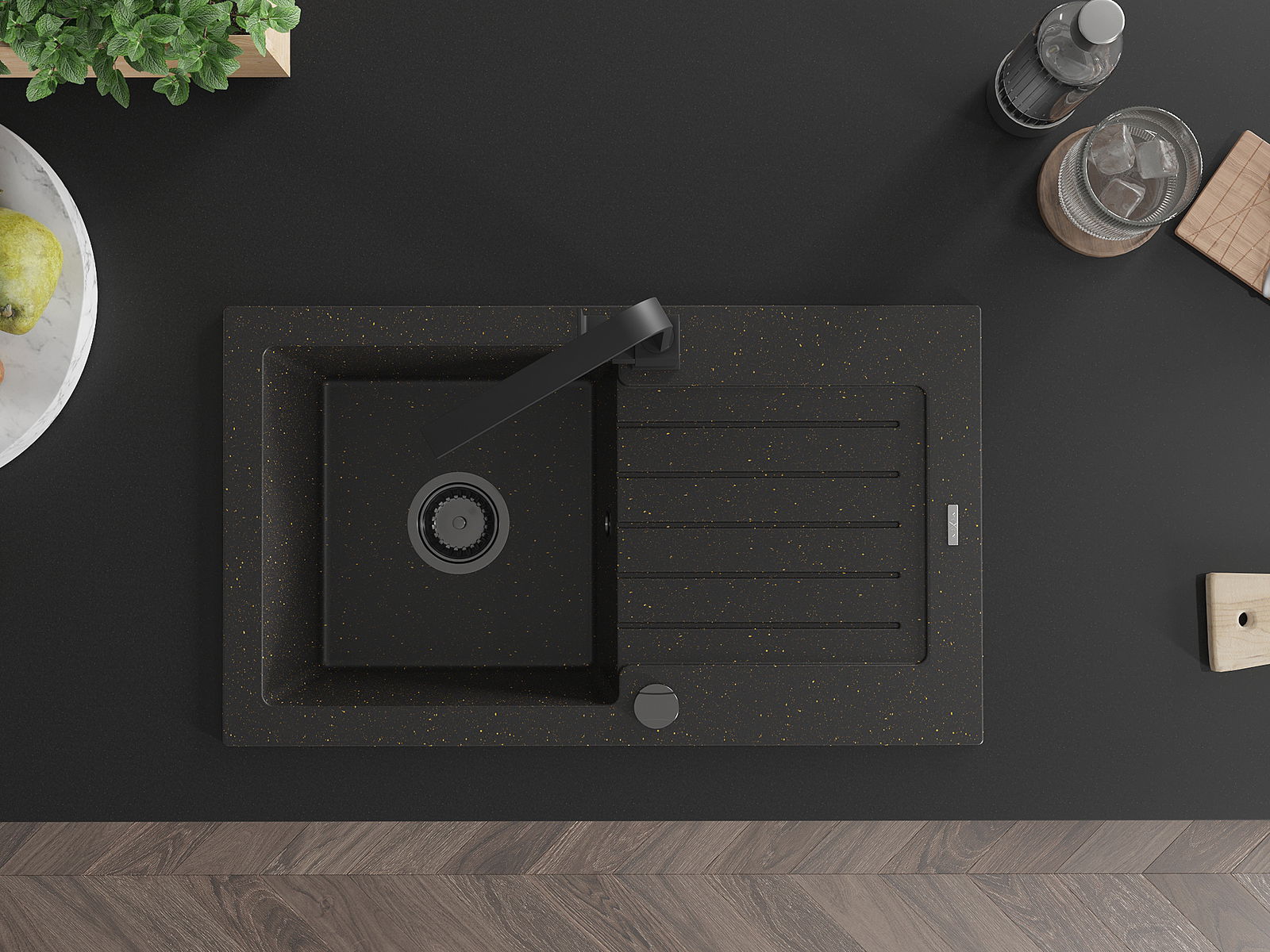 Mexen Pablo гранитна мивка с 1 корито и отцедник и кухненски смесител Rita, черно/златист металик - 6510-75-670300-70-B