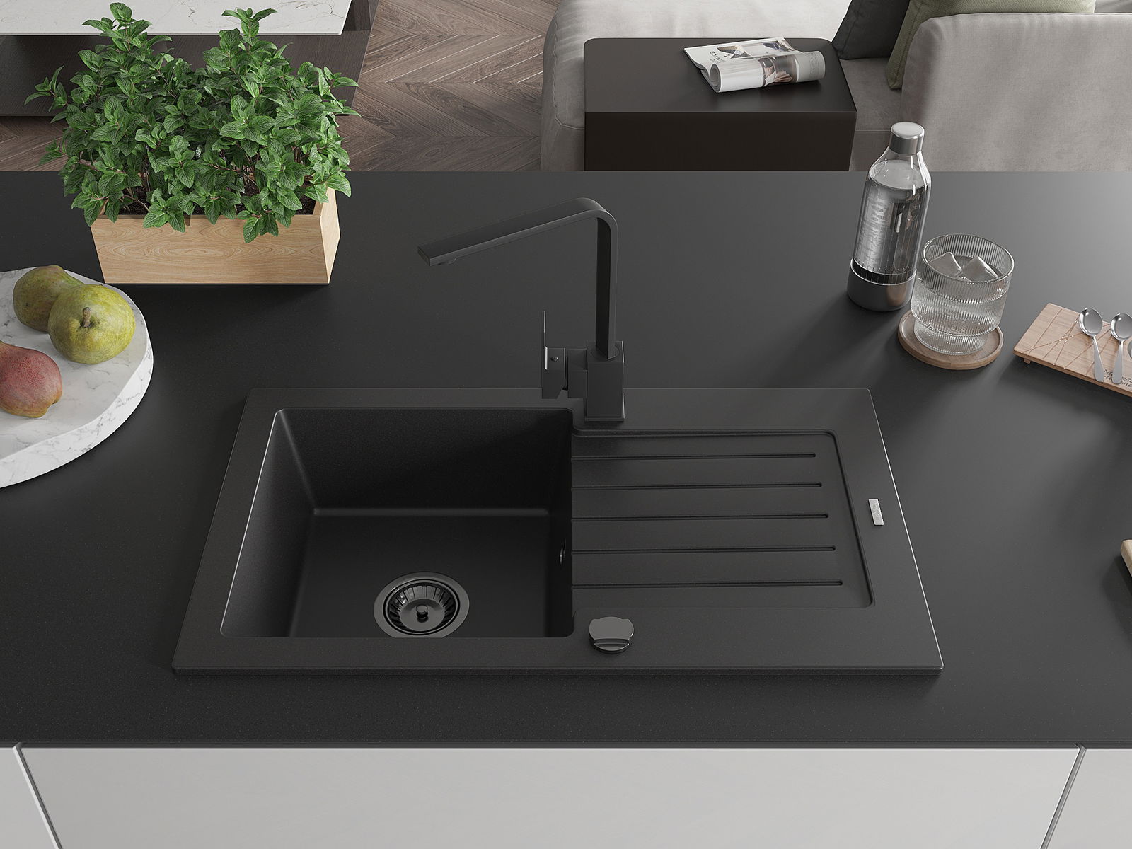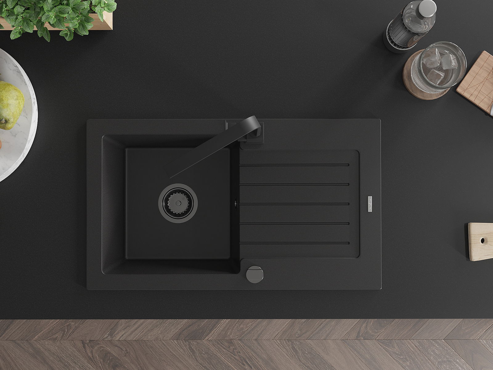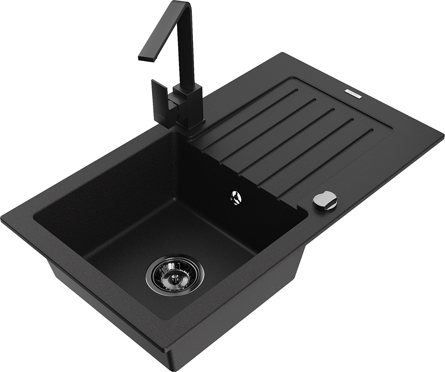 Mexen Pablo гранитна мивка с едно корито, отцеденик и кухненски смесител Rita, черен - 6510-77-670300-70-B