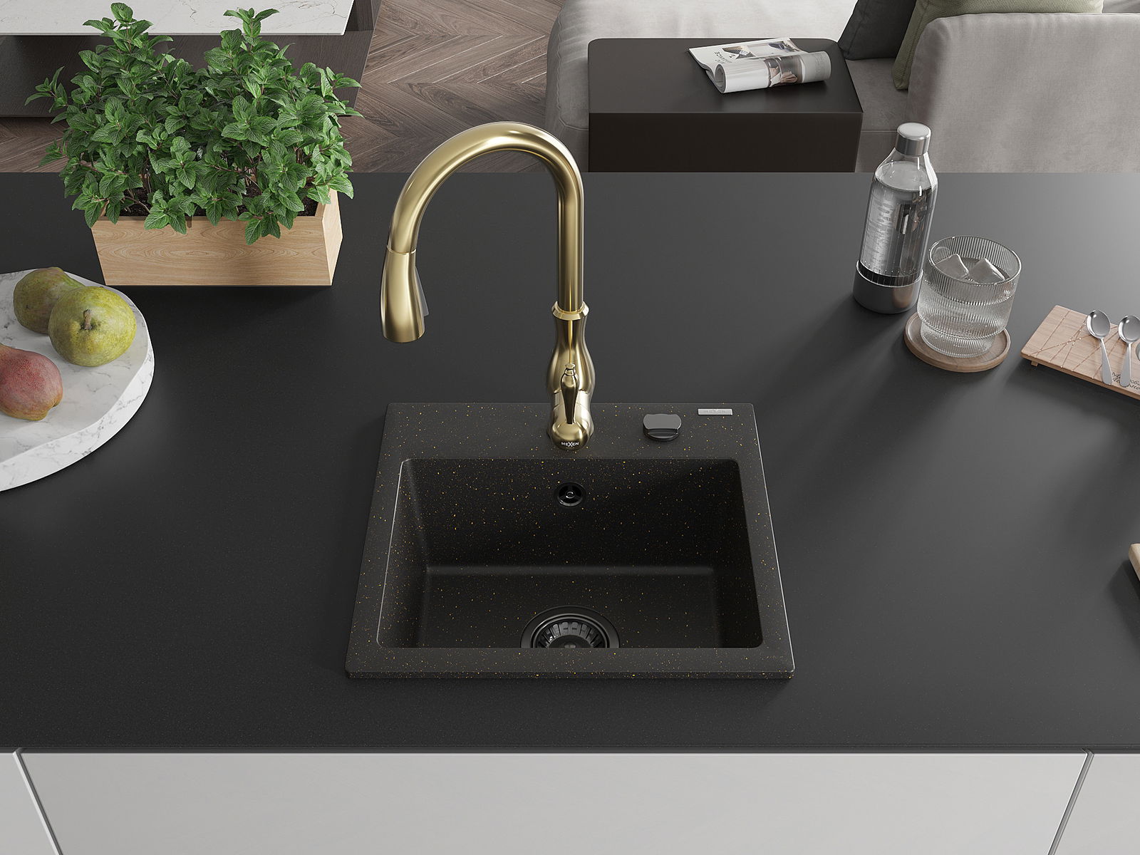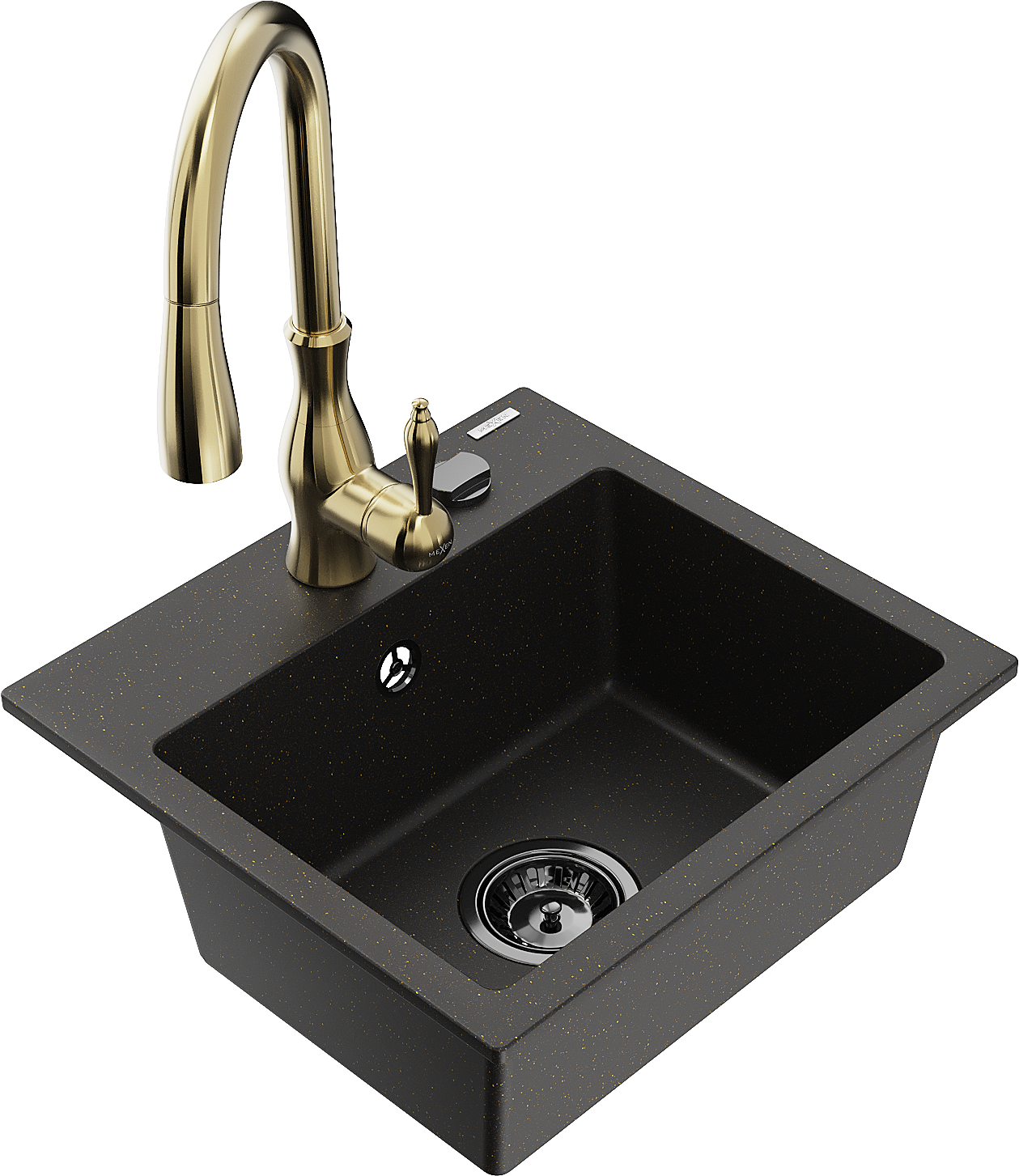 Mexen Milo гранитна мивка с 1 камера и кухненски смесител Savita, черен/златен металик- 6505-75-672601-50-B