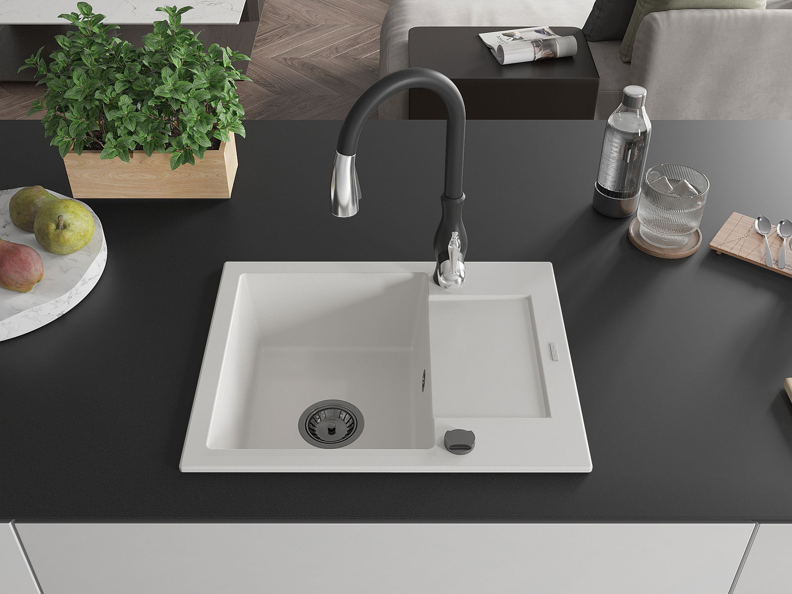 Мивката е направена от висококачествен гранит. Това е елегантно и най -вече практично допълнение към всяка кухня, независимо от нейния стил. Висококачествената и гранитна издръжливост осигуряват много години употреба.