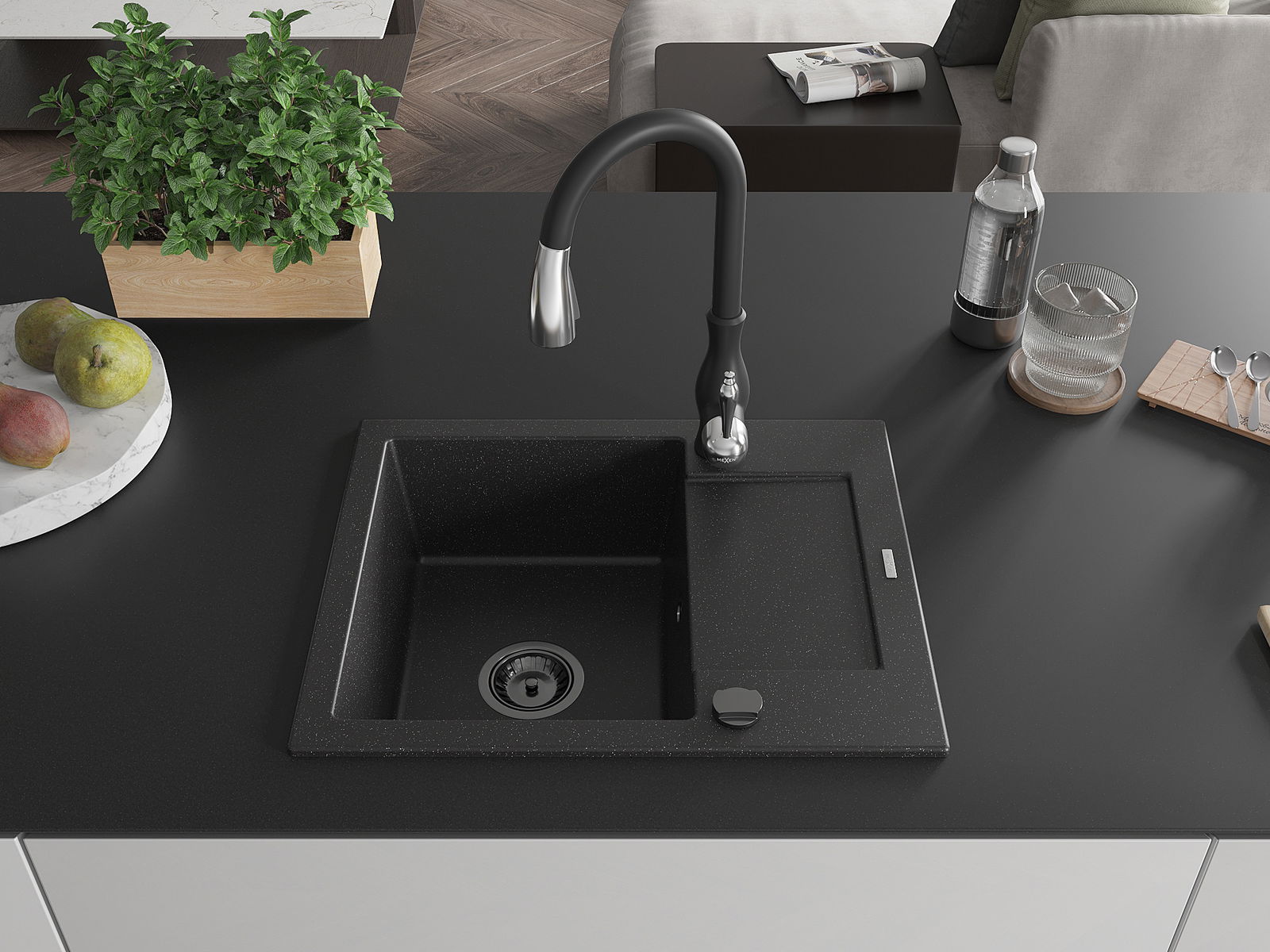 Мивката е направена от висококачествен гранит. Това е елегантно и най -вече практично допълнение към всяка кухня, независимо от нейния стил. Висококачествената и гранитна издръжливост осигуряват много години употреба.