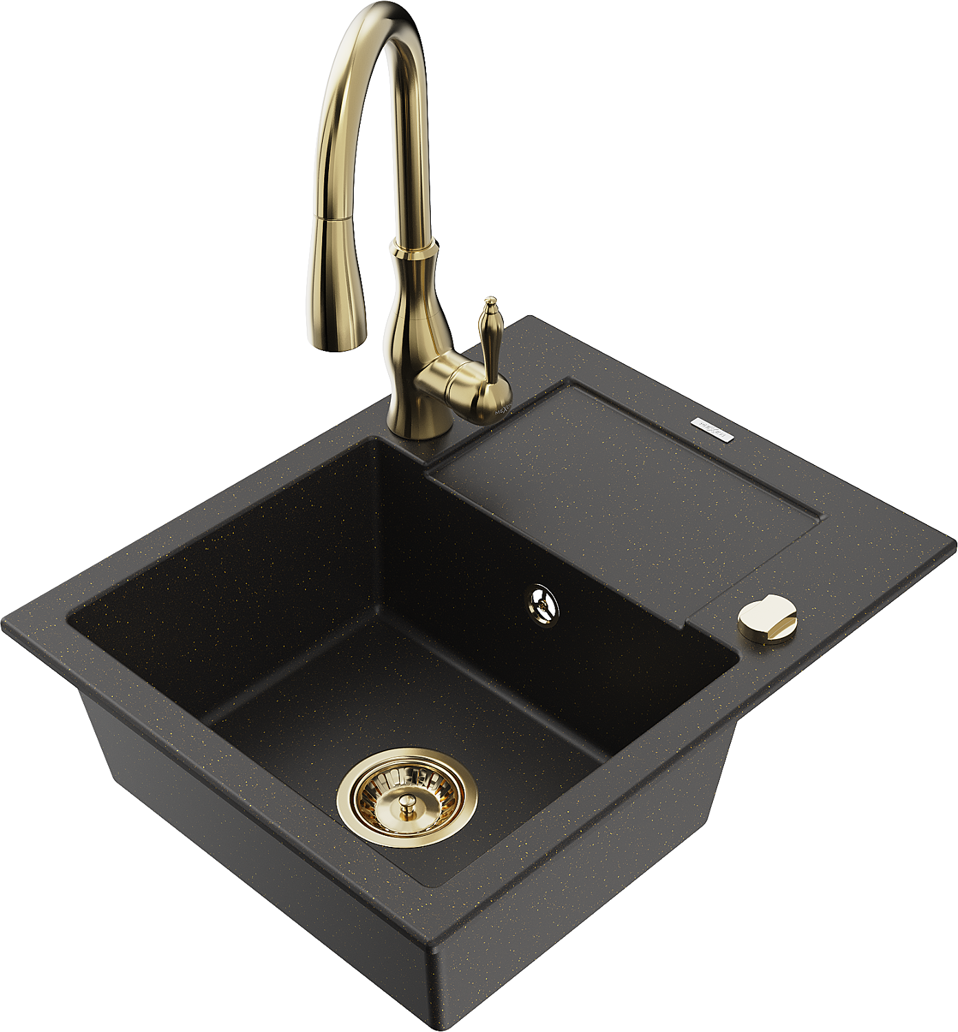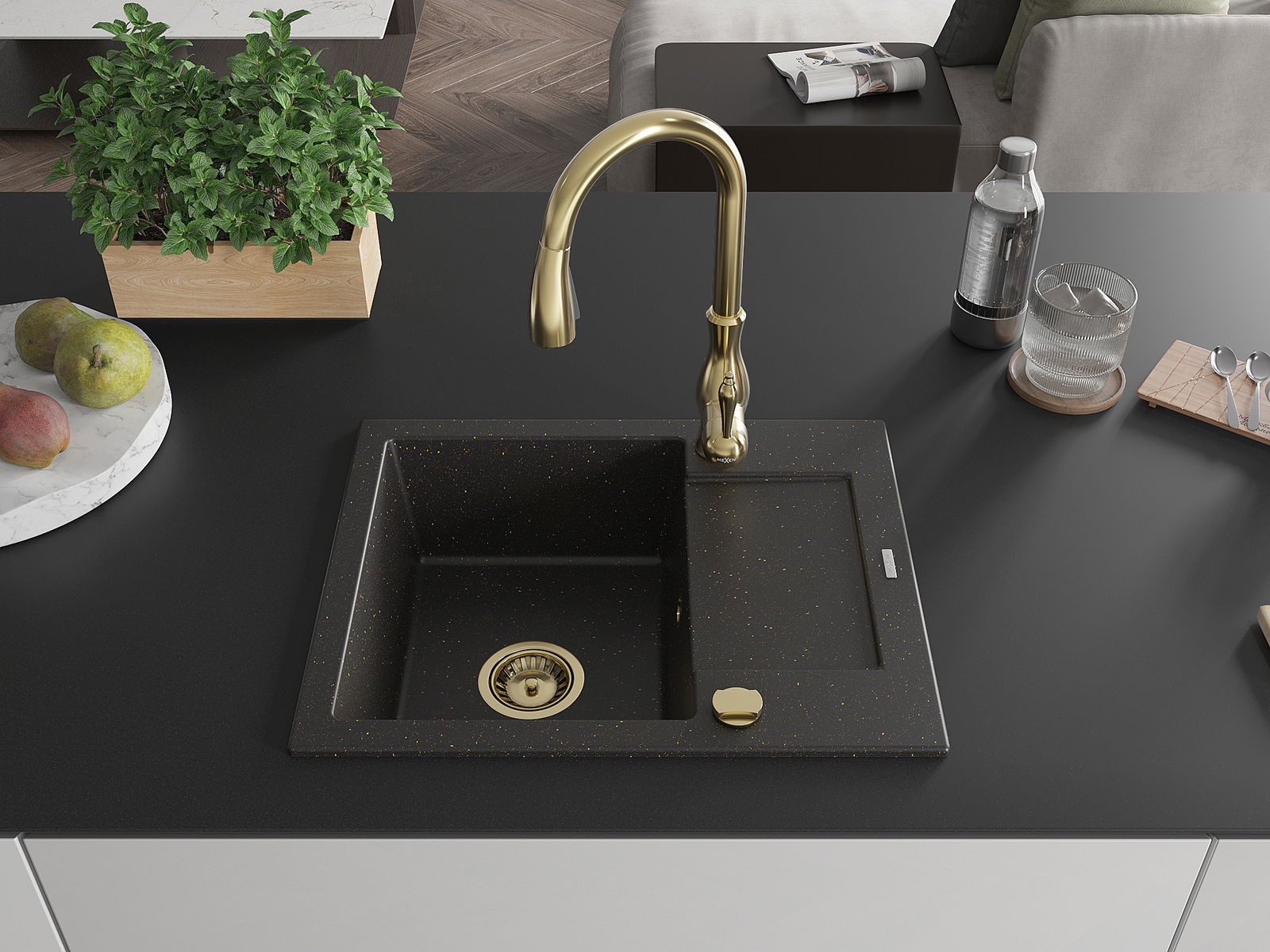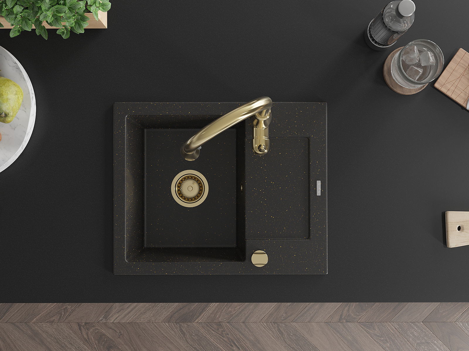 Mexen Enzo гранитна мивка с 1 отделение и отцедник и кухненски смесител Savita, черен/златен металик - 6506-75-672601-50