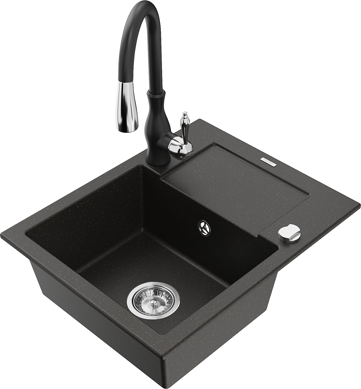 Mexen Enzo гранитна кухненска мивка с 1 корито с отцедник и кухненски смесител Savita, черен/златист металик - 6506-75-672601-7?