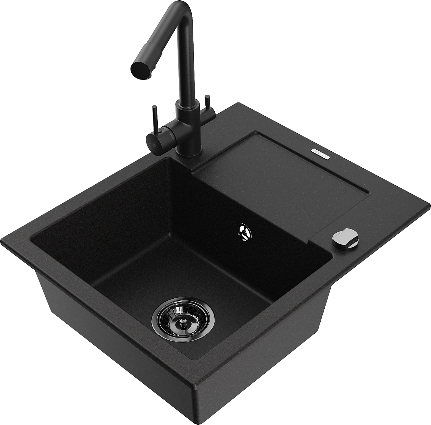 Mexen Enzo гранитна кухненска мивка с 1 корито с отцедник и кухненски смесител Duero, черен - 6506-77-671600-70-B