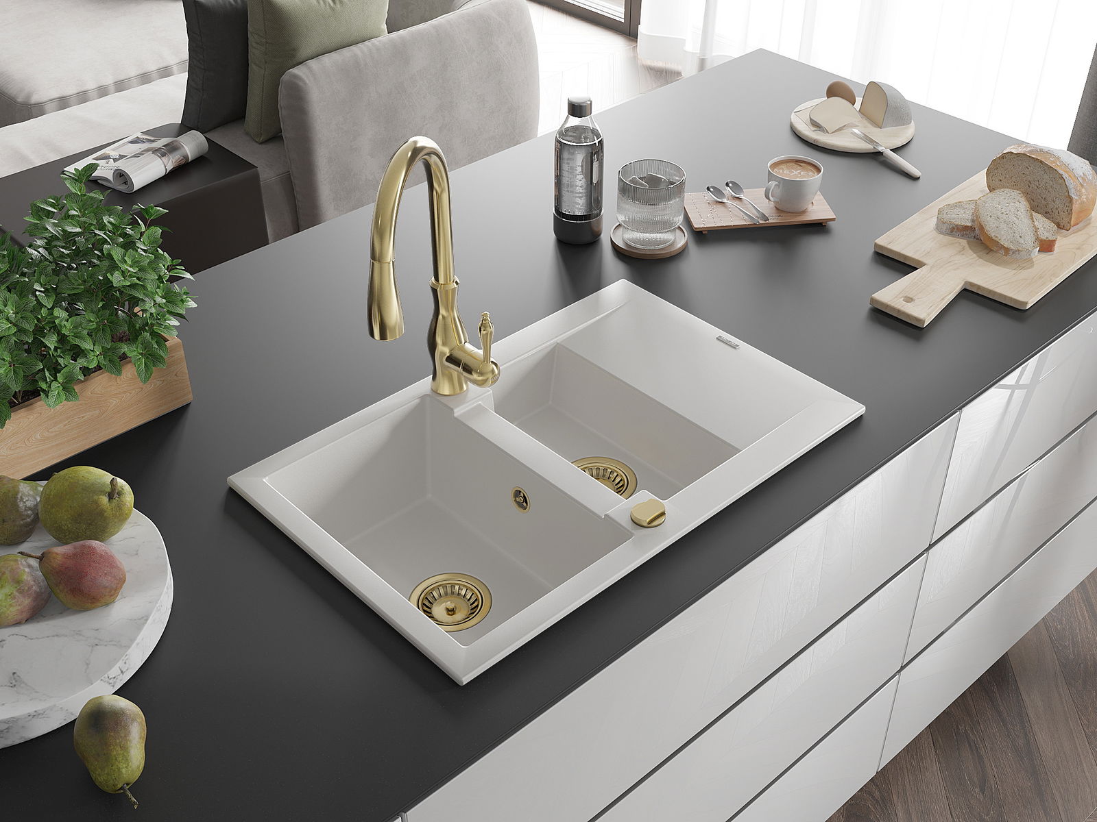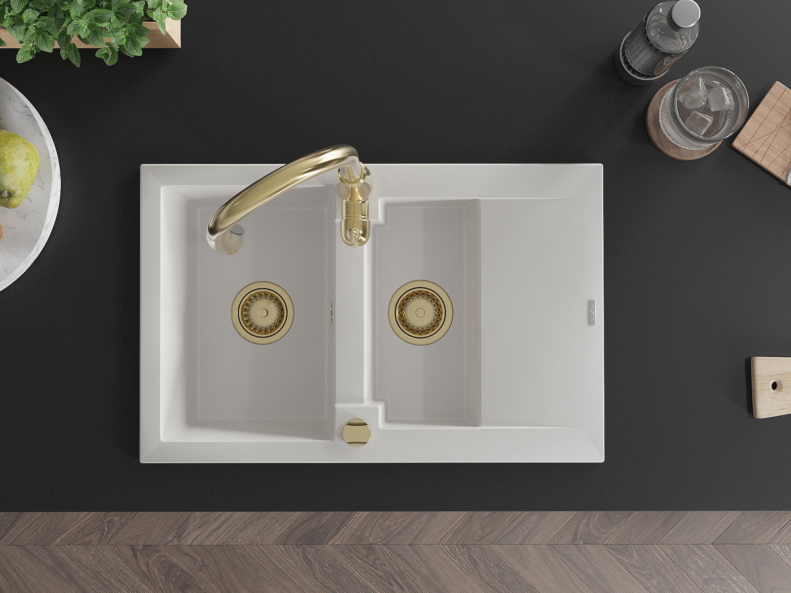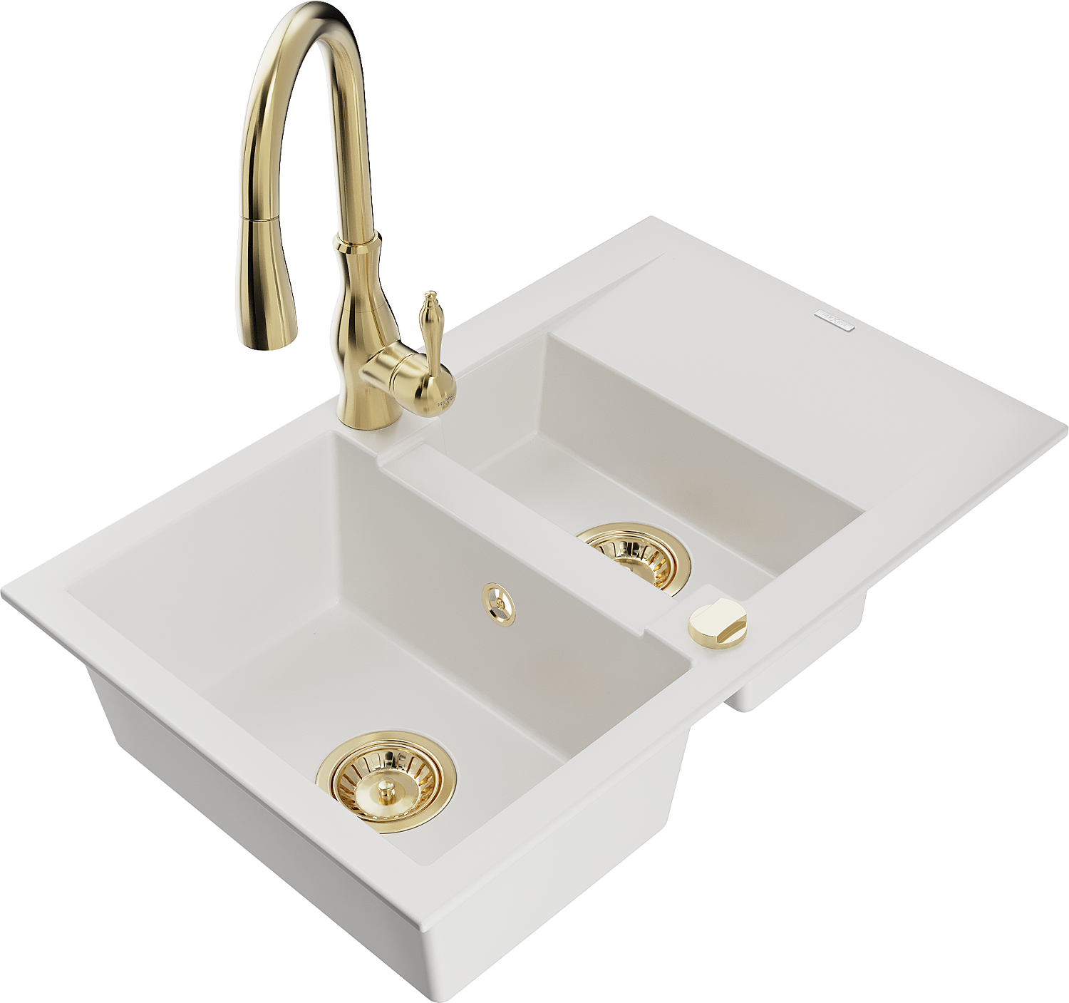 Mexen Gaspar гранитна мивка 1,5-камерна с отцедник и кухненски смесител Savita, бял - 6507-20-672601-50