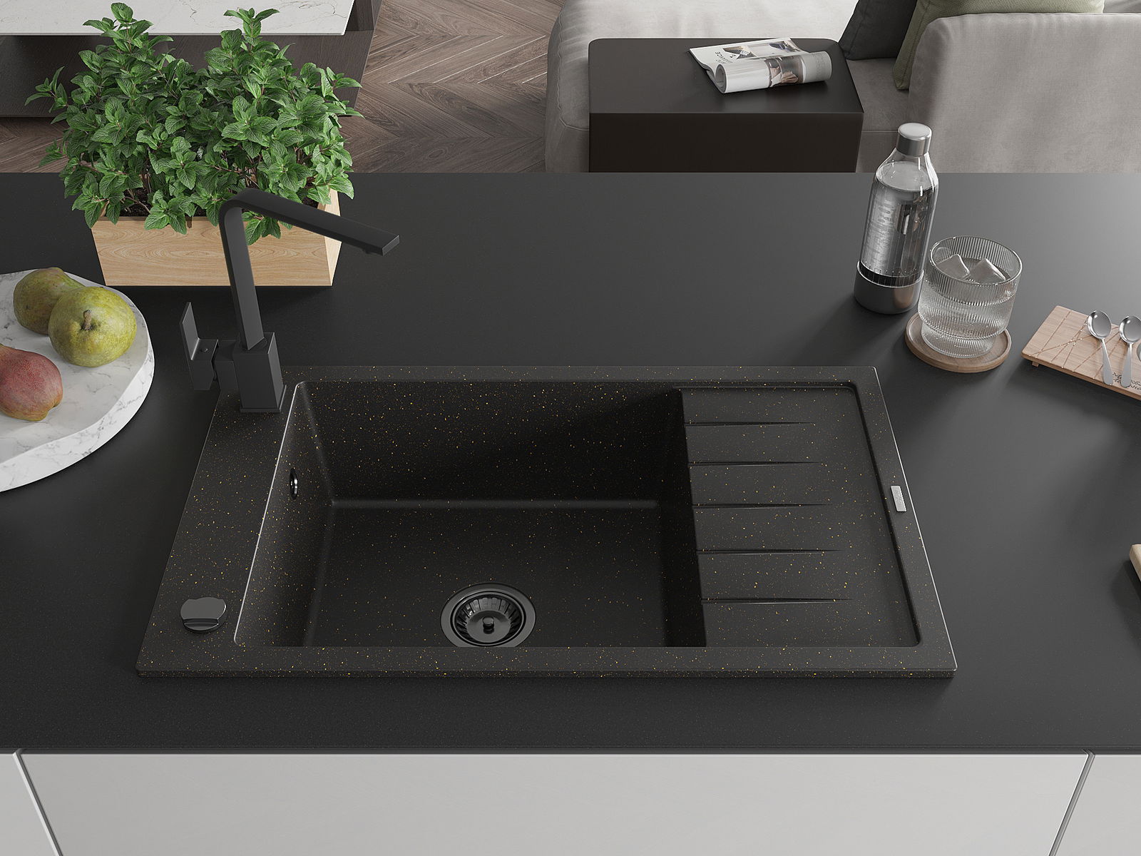 Mexen Elias гранитна мивка с 1 отделение с дренаж и кухненски смесител Rita, черно/златист металик - 6511-75-670300-70-B