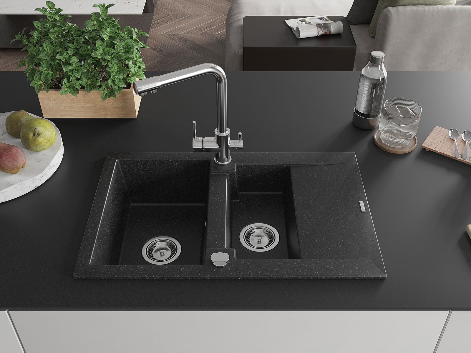 Мивката е направена от висококачествен гранит. Това е елегантно и най -вече практично допълнение към всяка кухня, независимо от нейния стил. Висококачествената и гранитна издръжливост осигуряват много години употреба.