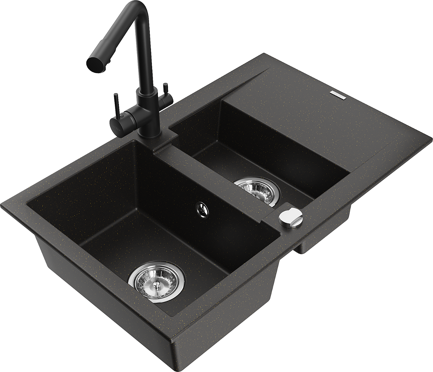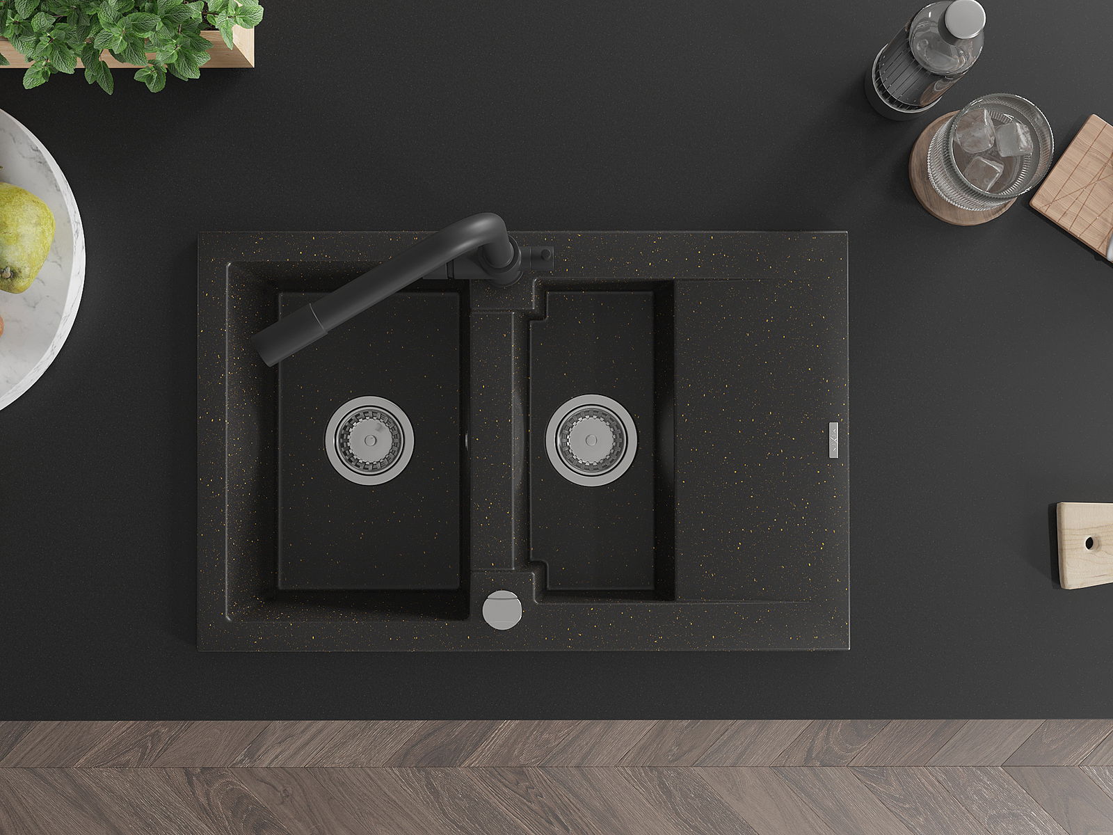 Мивка от гранит Mexen Gaspar, 1,5-камерна с канал и кухненски смесител Duero, черен/златен - 6507-75-671600-70