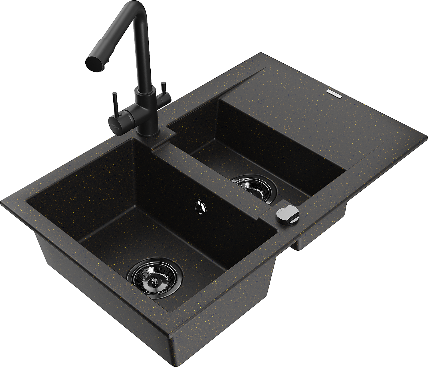 Mexen Gaspar гранитна мивка 1,5-камерна с отцедник и кухненски смесител Duero, черно/златно - 6507-75-671600-70-B
