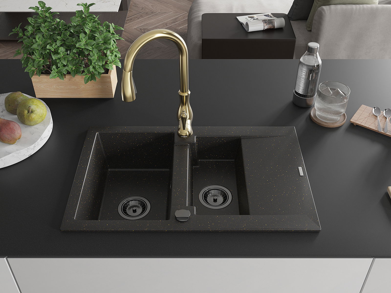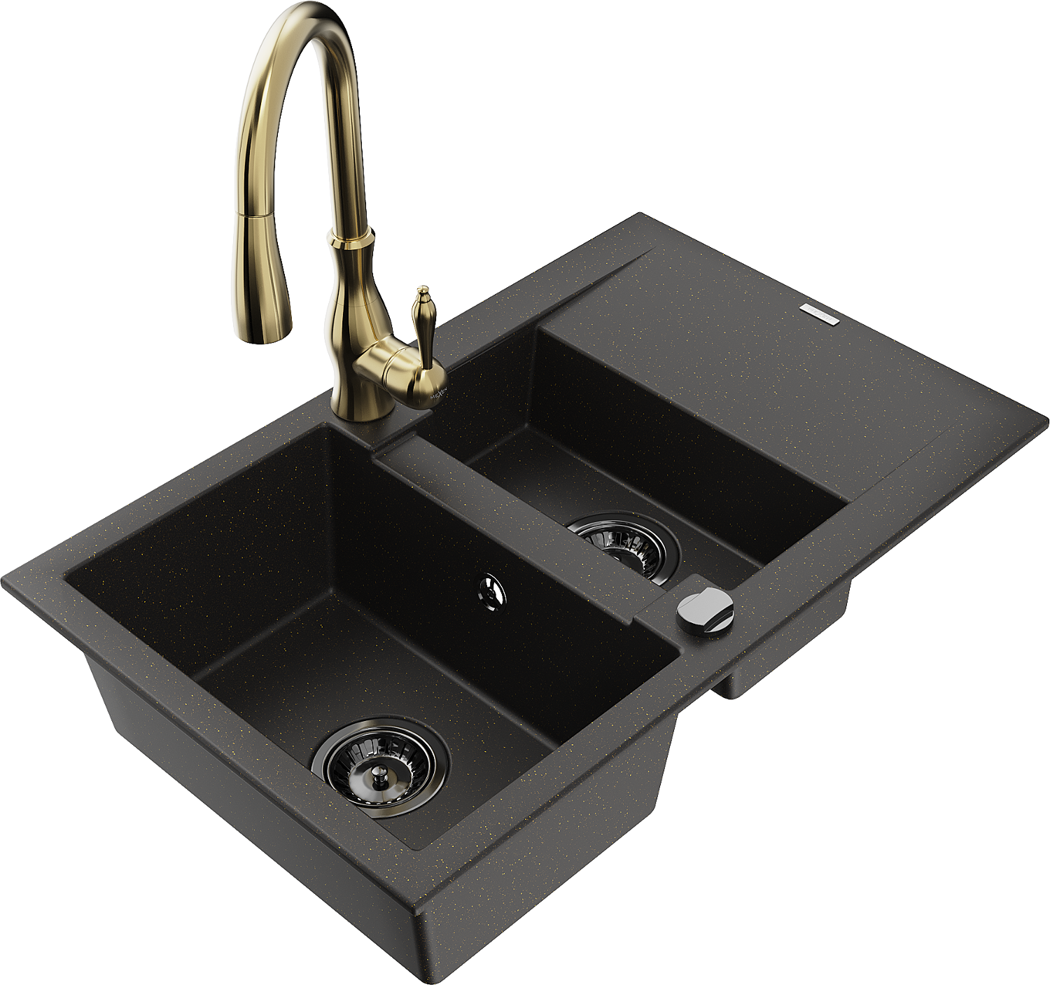 Mexen Gaspar гранитна мивка с 1,5 отделение, отцедник и кухненски кран Savita, черно/златно - 6507-75-672601-50-B