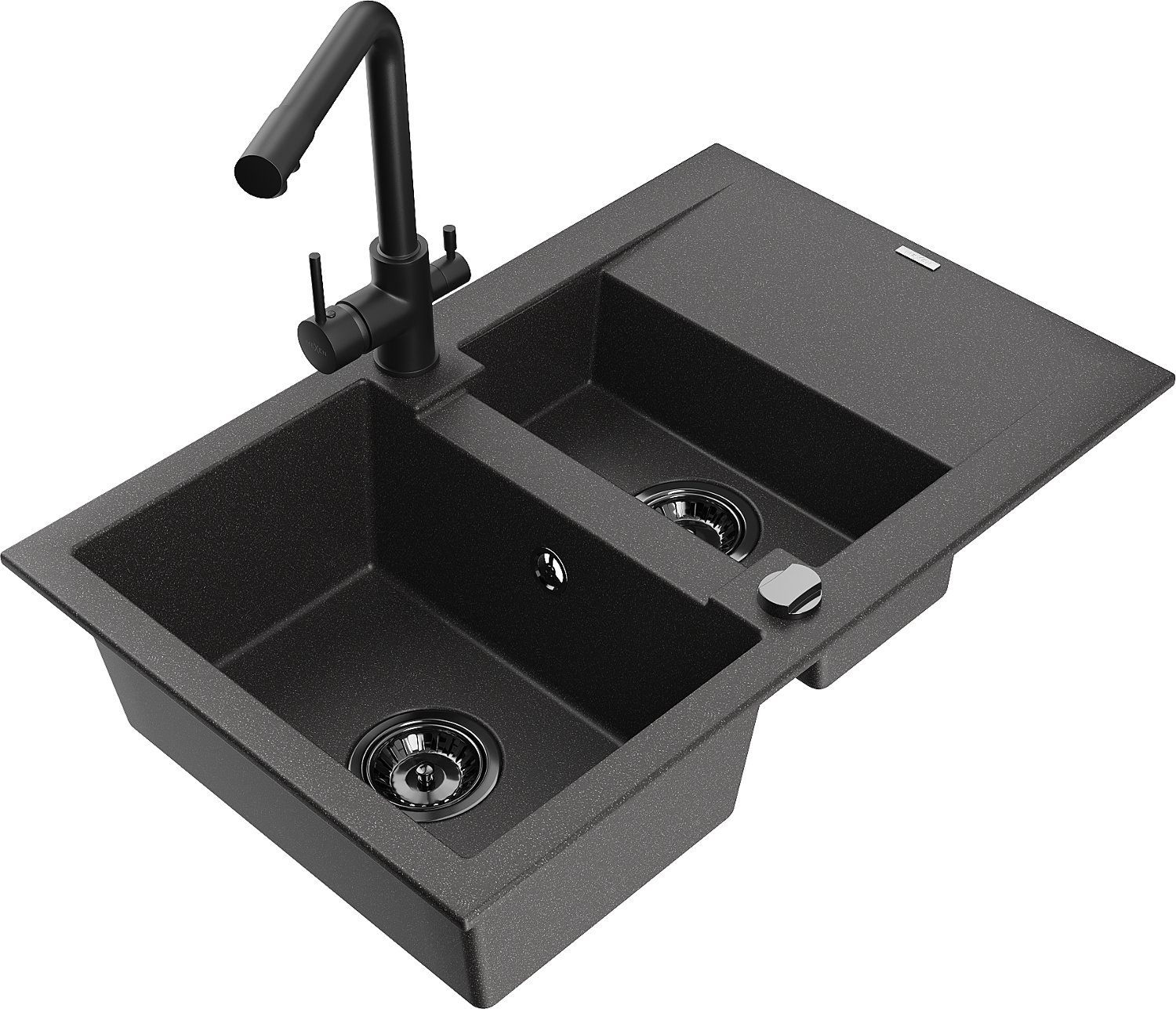 Гранитна мивка Mexen Gaspar 1,5-камерна с отцедник и кухненски смесител Duero, черен напукан - 6507-76-671600-70-B